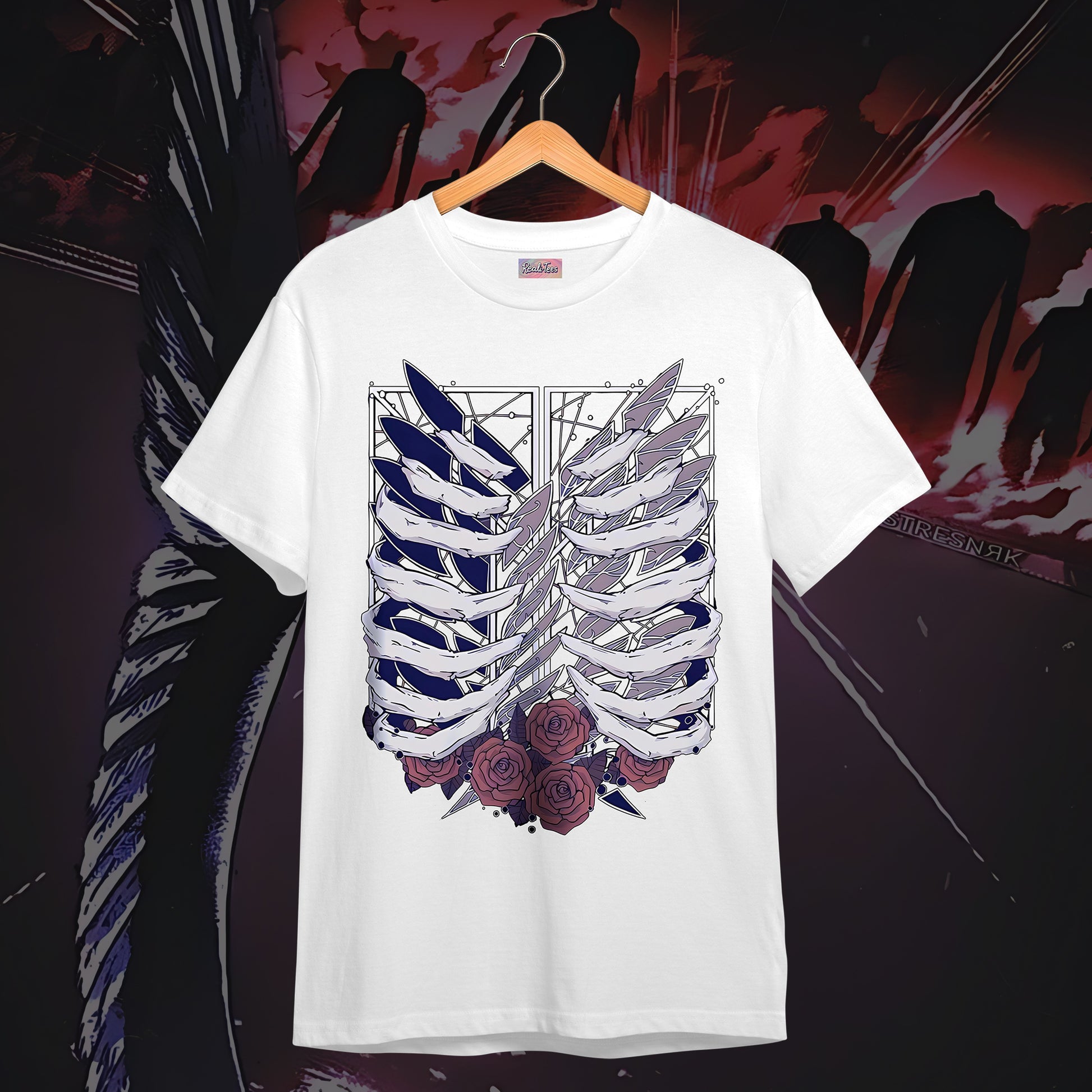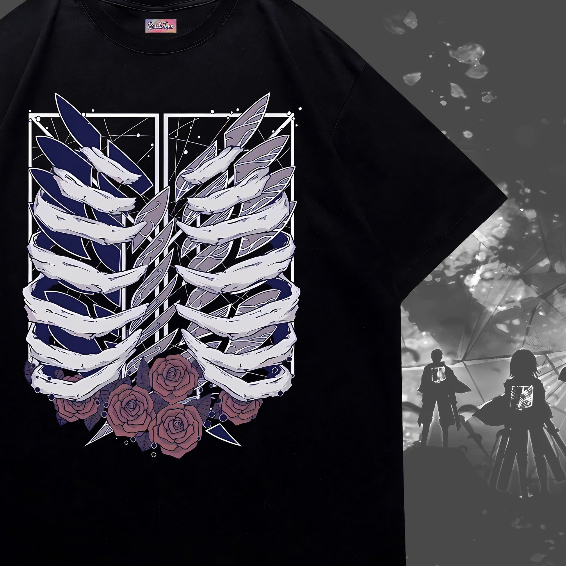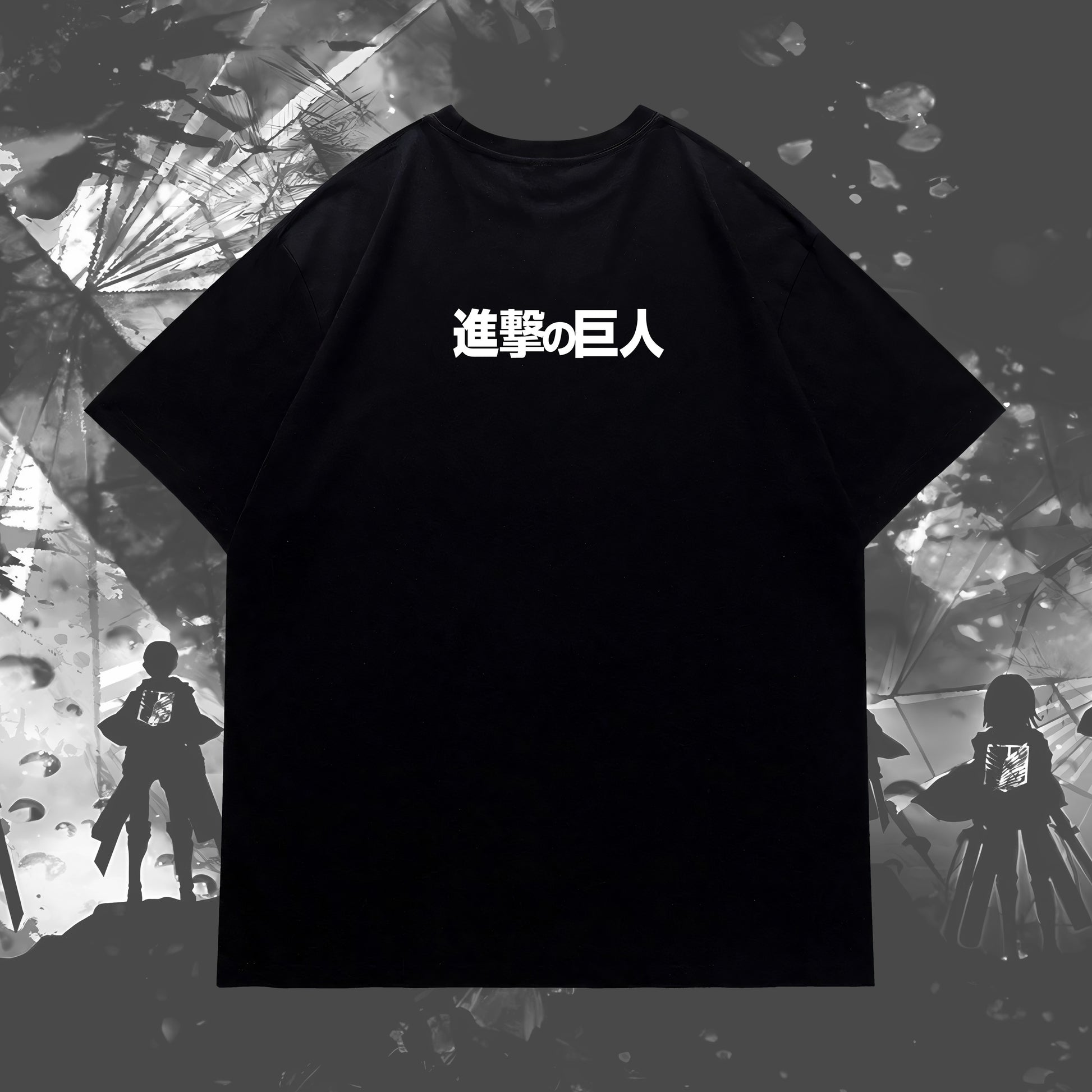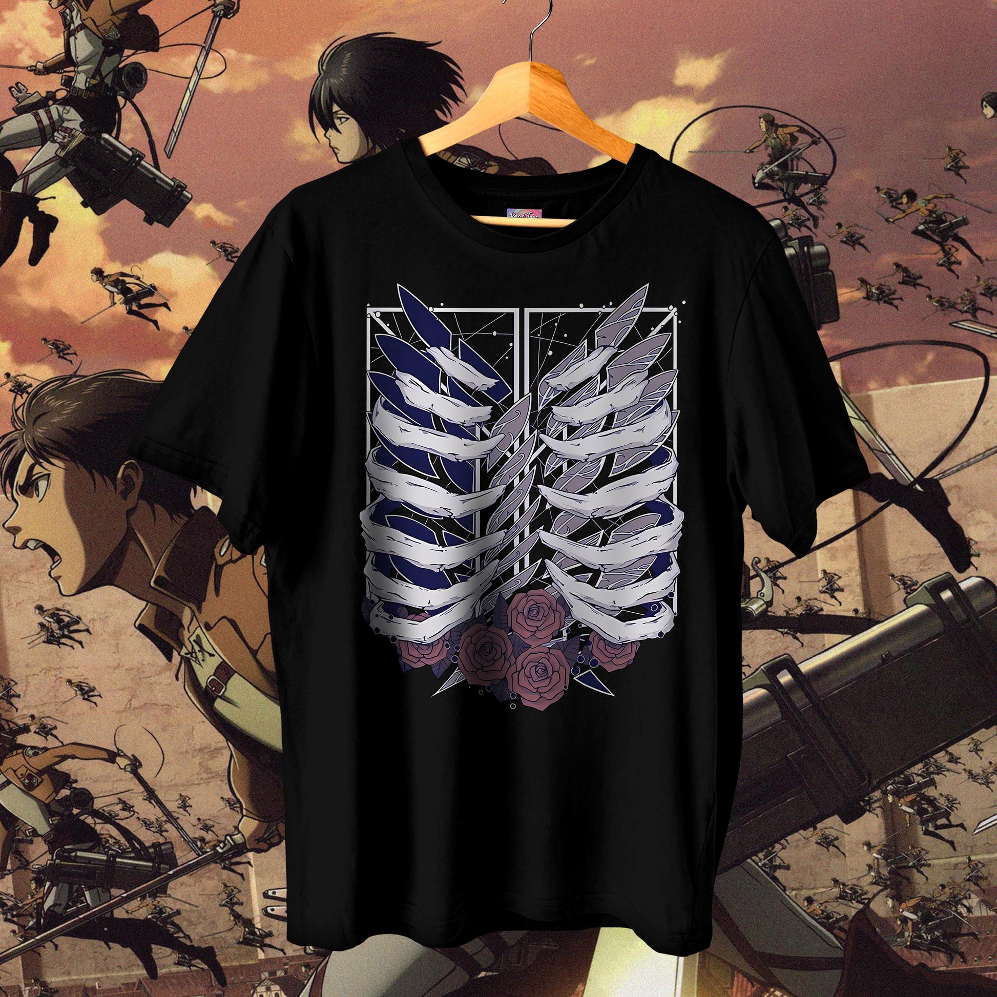 A striking blend of dark elegance and anime symbolism, this tee features a ribcage design entwined with roses, capturing the essence of Attack on Titan’s raw beauty and tragedy. The minimalist back carries the Japanese title “進撃の巨人,” keeping the look clean while resonating deeply with true fans. Available in both black and white, it’s a bold yet versatile statement piece for any AoT admirer.