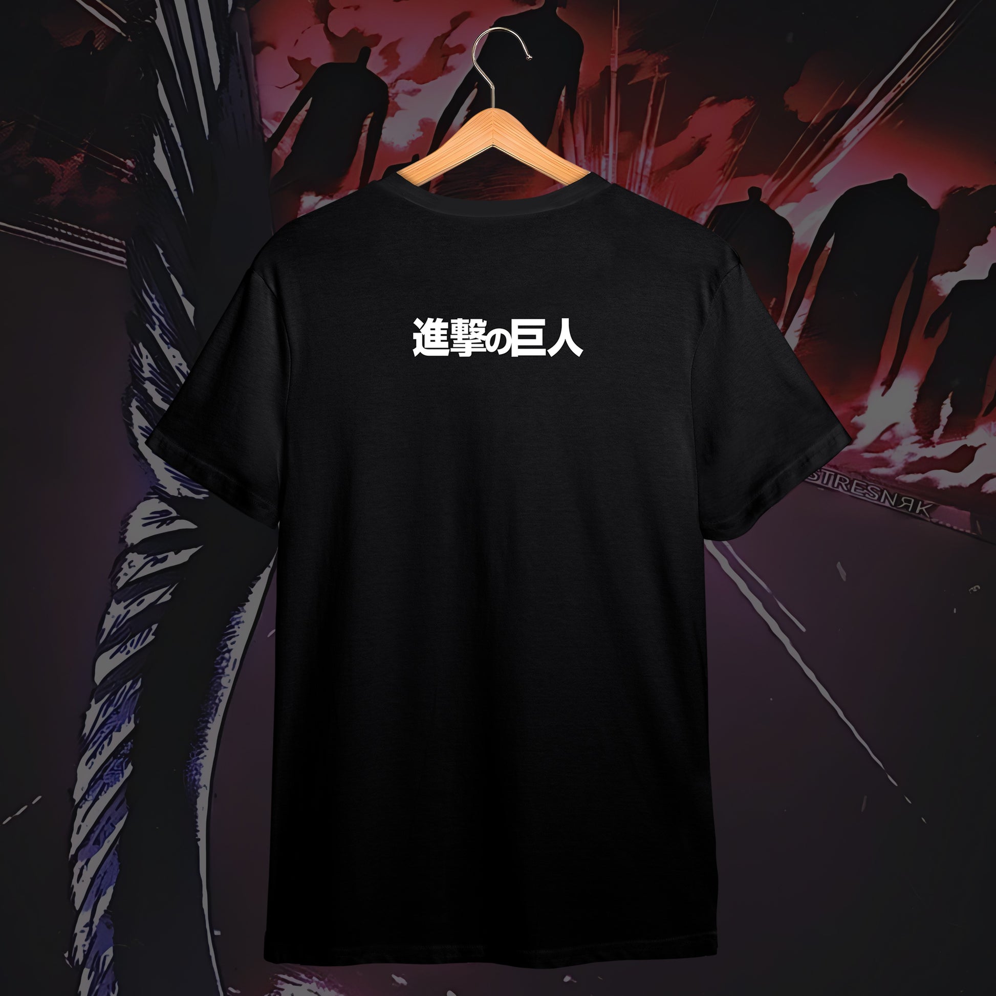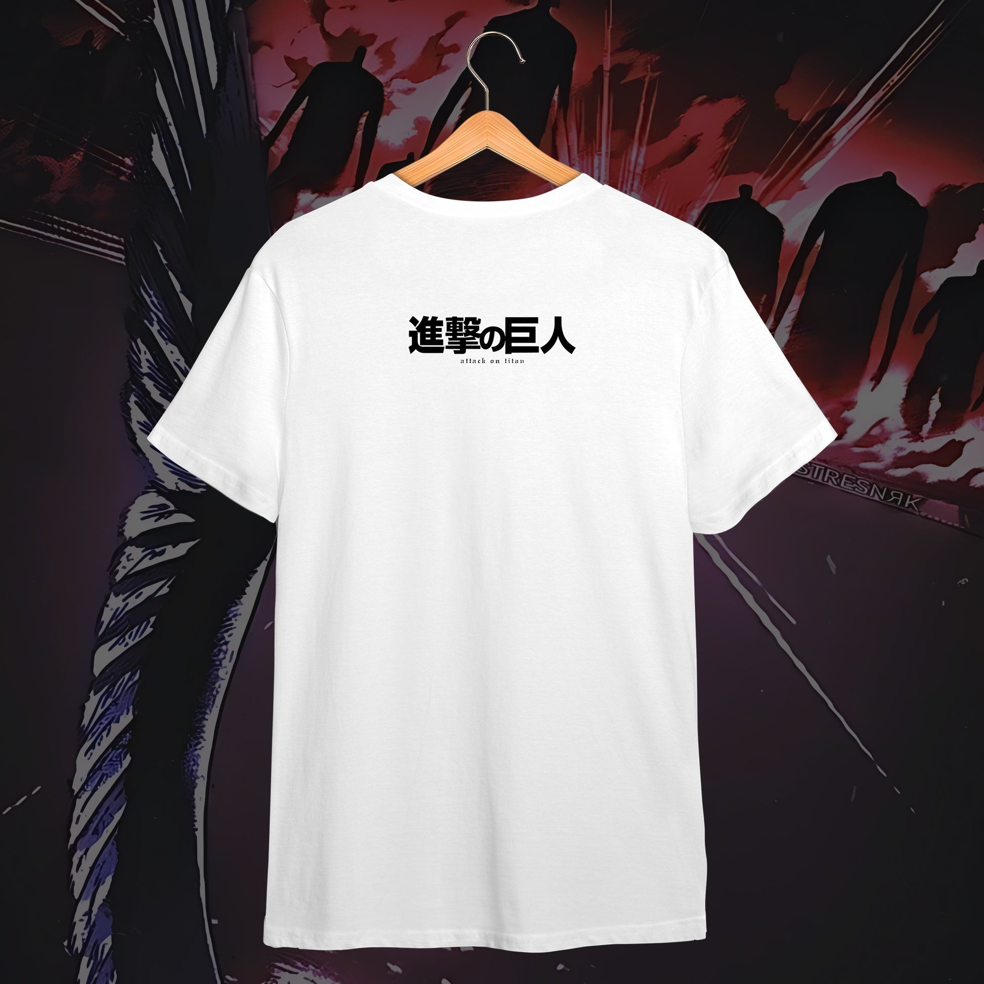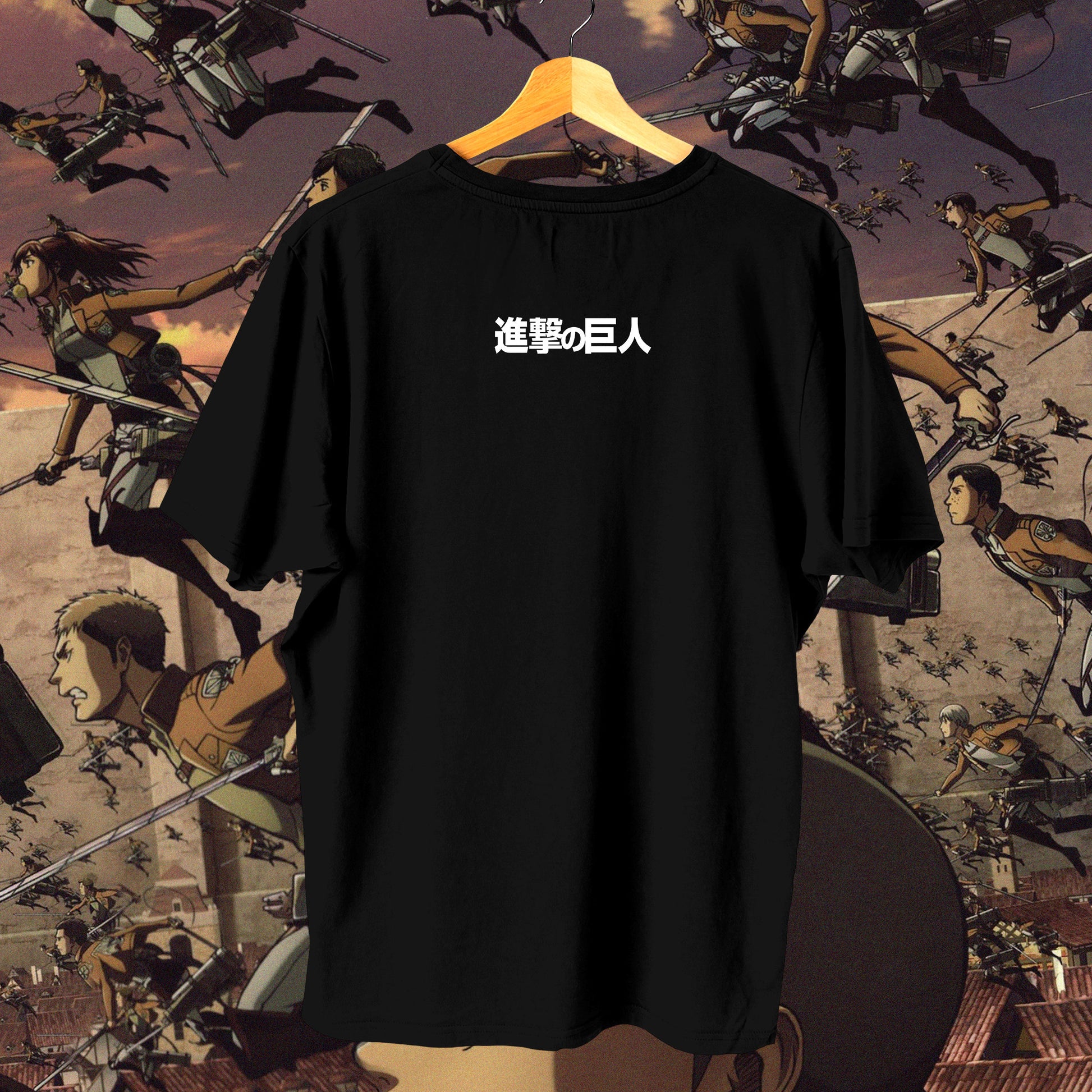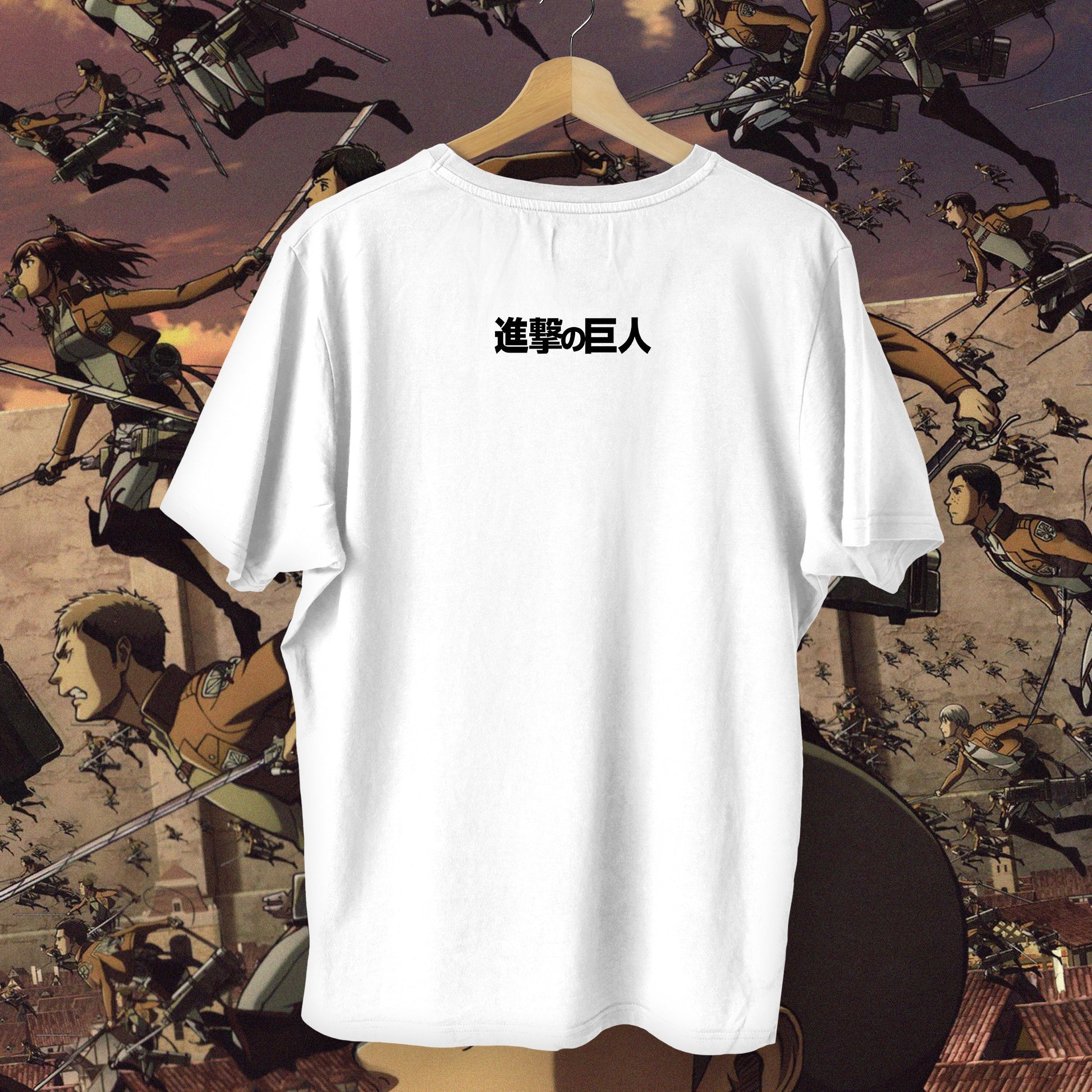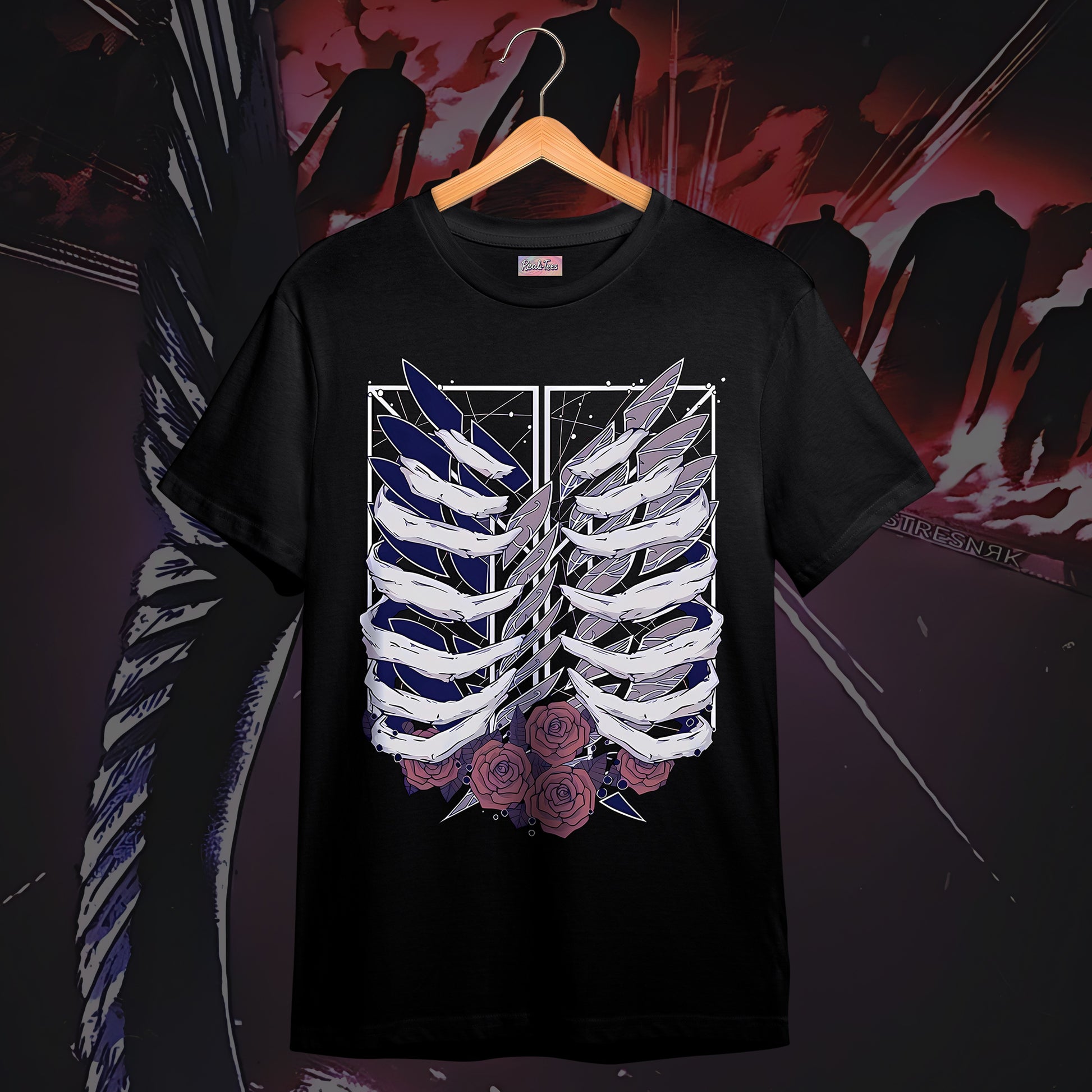 A striking blend of dark elegance and anime symbolism, this tee features a ribcage design entwined with roses, capturing the essence of Attack on Titan’s raw beauty and tragedy. The minimalist back carries the Japanese title “進撃の巨人,” keeping the look clean while resonating deeply with true fans. Available in both black and white, it’s a bold yet versatile statement piece for any AoT admirer.