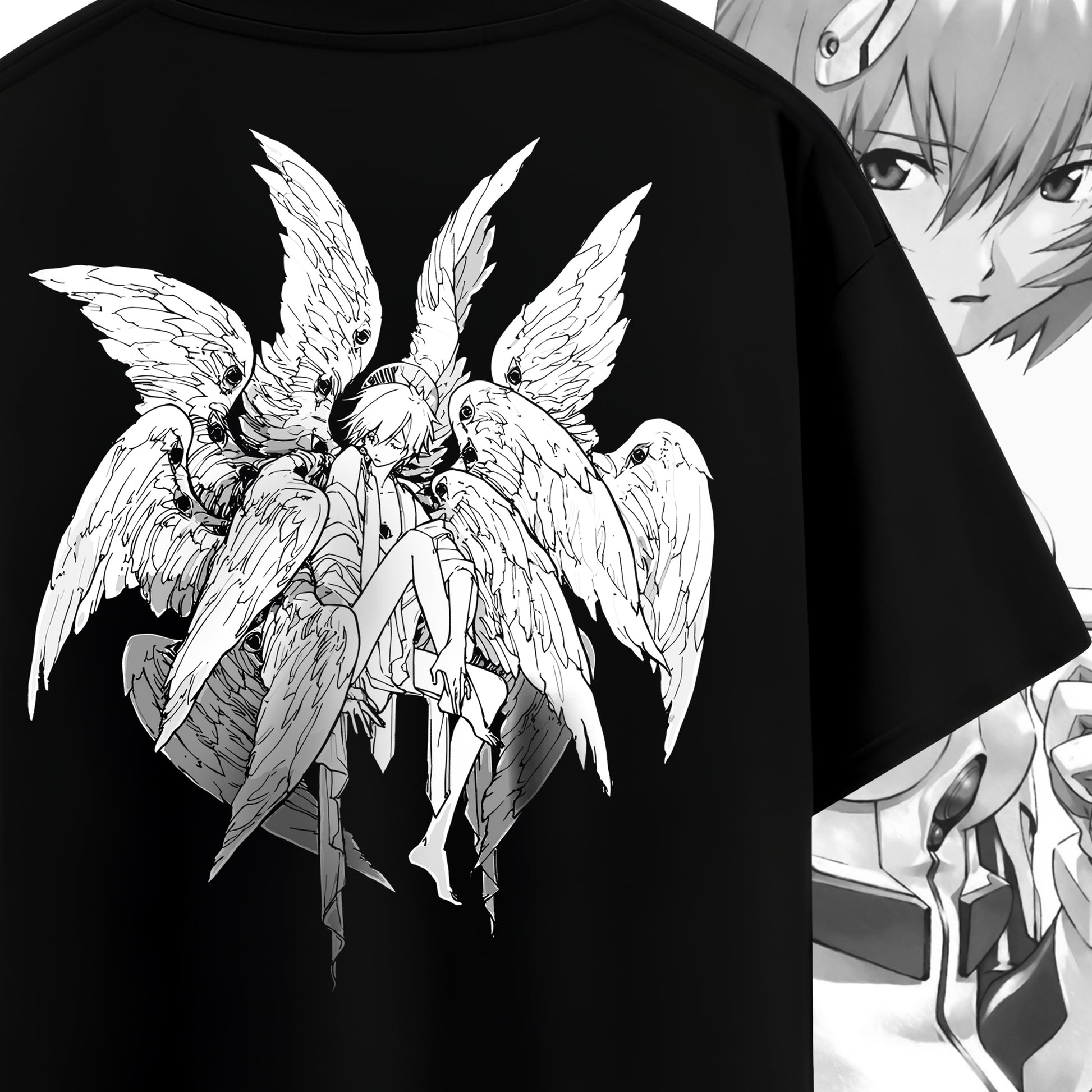 Embrace the divine and surreal imagery of the Third Impact with this ethereal Rei Ayanami design. Featuring a six-winged "Angelic" Rei on the back, this piece blends iconic 90s anime symbolism with a clean, high-contrast streetwear aesthetic. A must-have for those who appreciate the haunting beauty of the Evangelion finale.