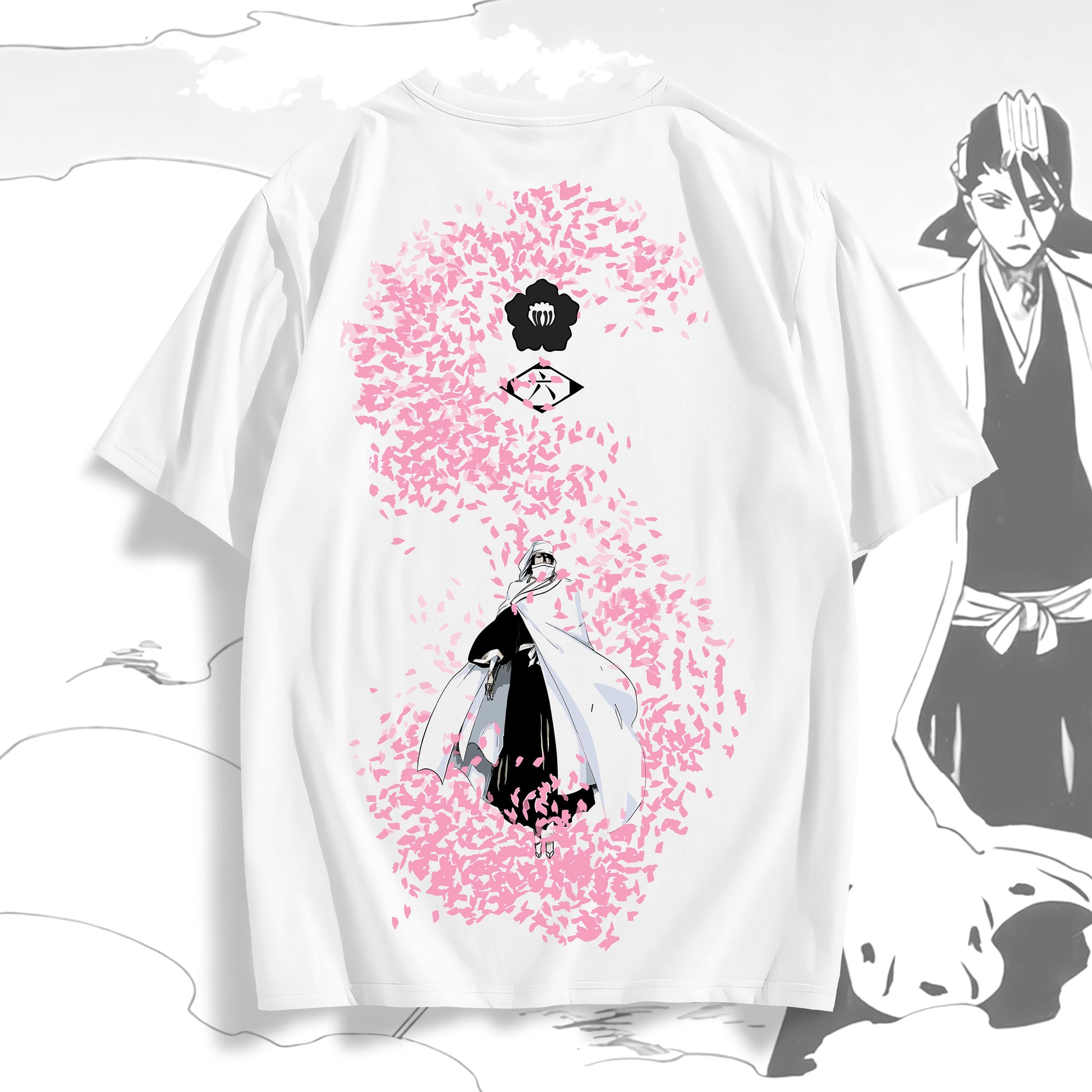 Step into serenity with this Byakuya tee featuring a sakura-laced silhouette and Senbonzakura’s blade on the front. Pure elegance, worn in style.