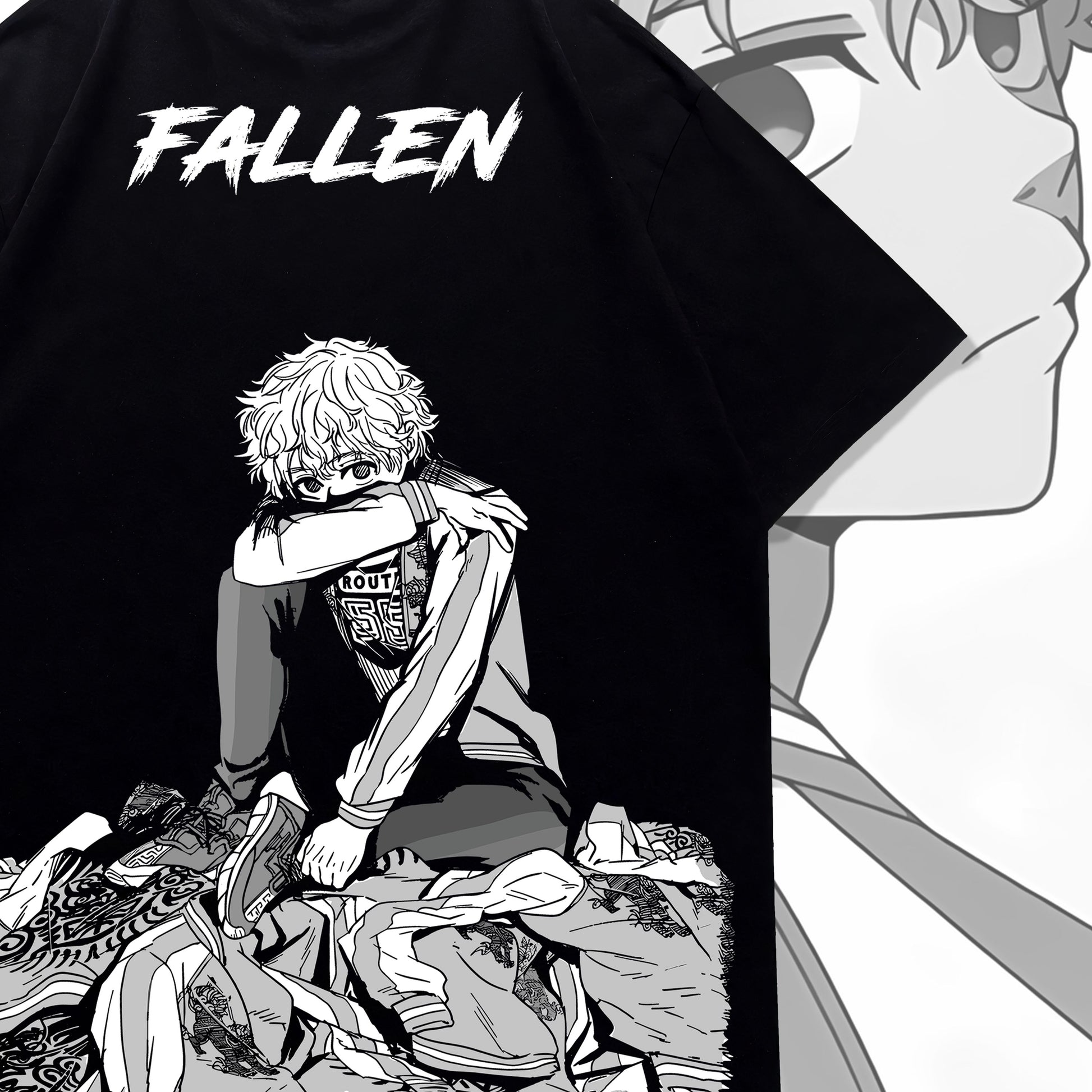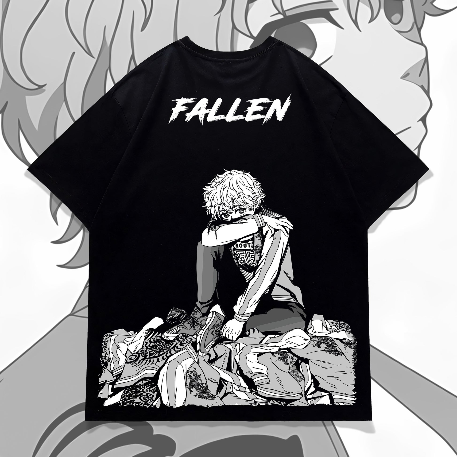 Choji sits amidst the rubble — bruised, bleeding, and burdened. The word FALLEN hangs heavy above a moment of silence, loss, and loyalty. This tee captures the raw aftermath of battle in Wind Breaker, a snapshot of Choji at his most vulnerable. On the front, his gang’s emblem is printed boldly over the heart — a mark of identity, pride, and the weight it carries.