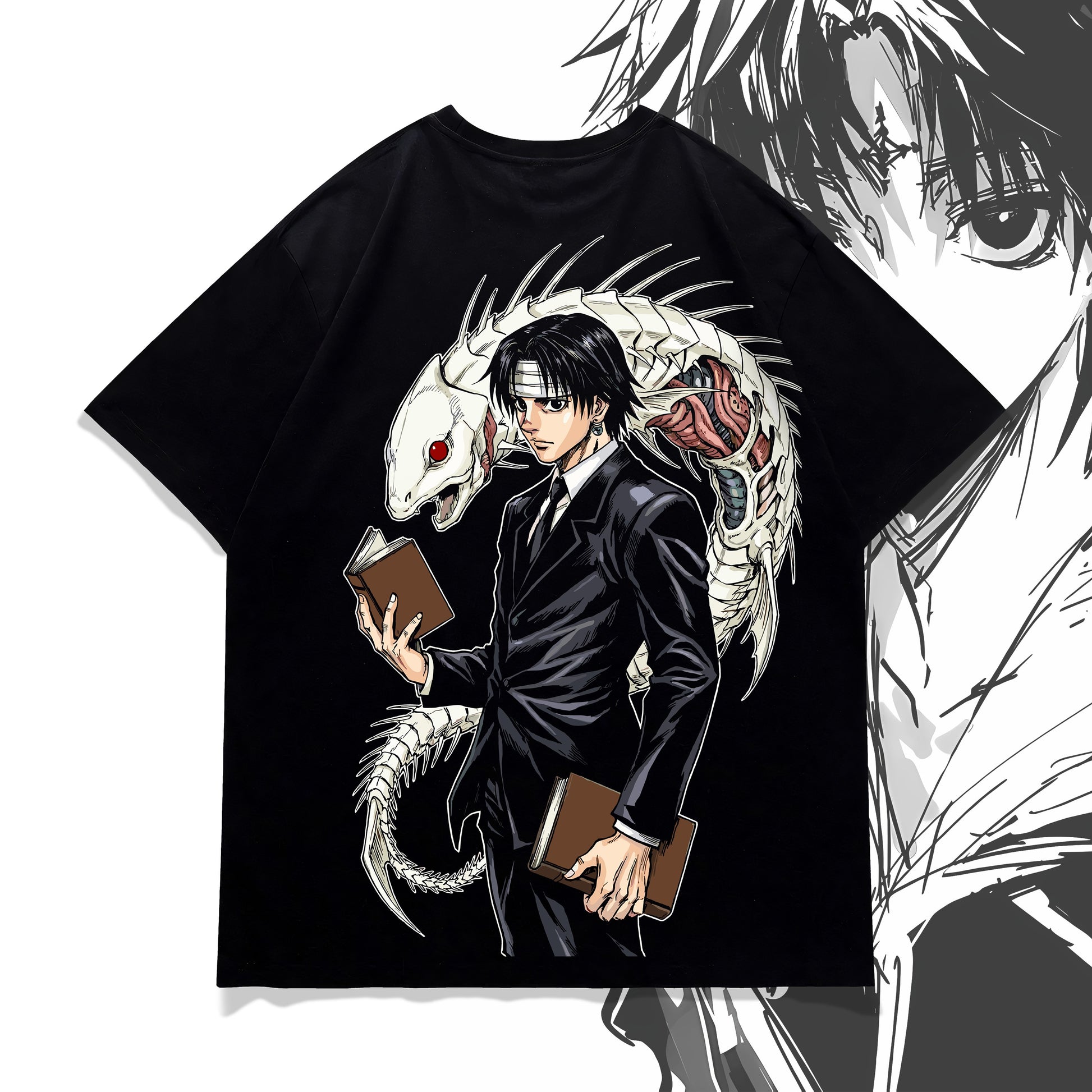 The front keeps it minimal with a sharp, symbolic emblem, while the back unveils Chrollo in his calm, unreadable form. Book in hand, suit immaculate, with a grotesque Nen beast curling behind him like a living shadow.
