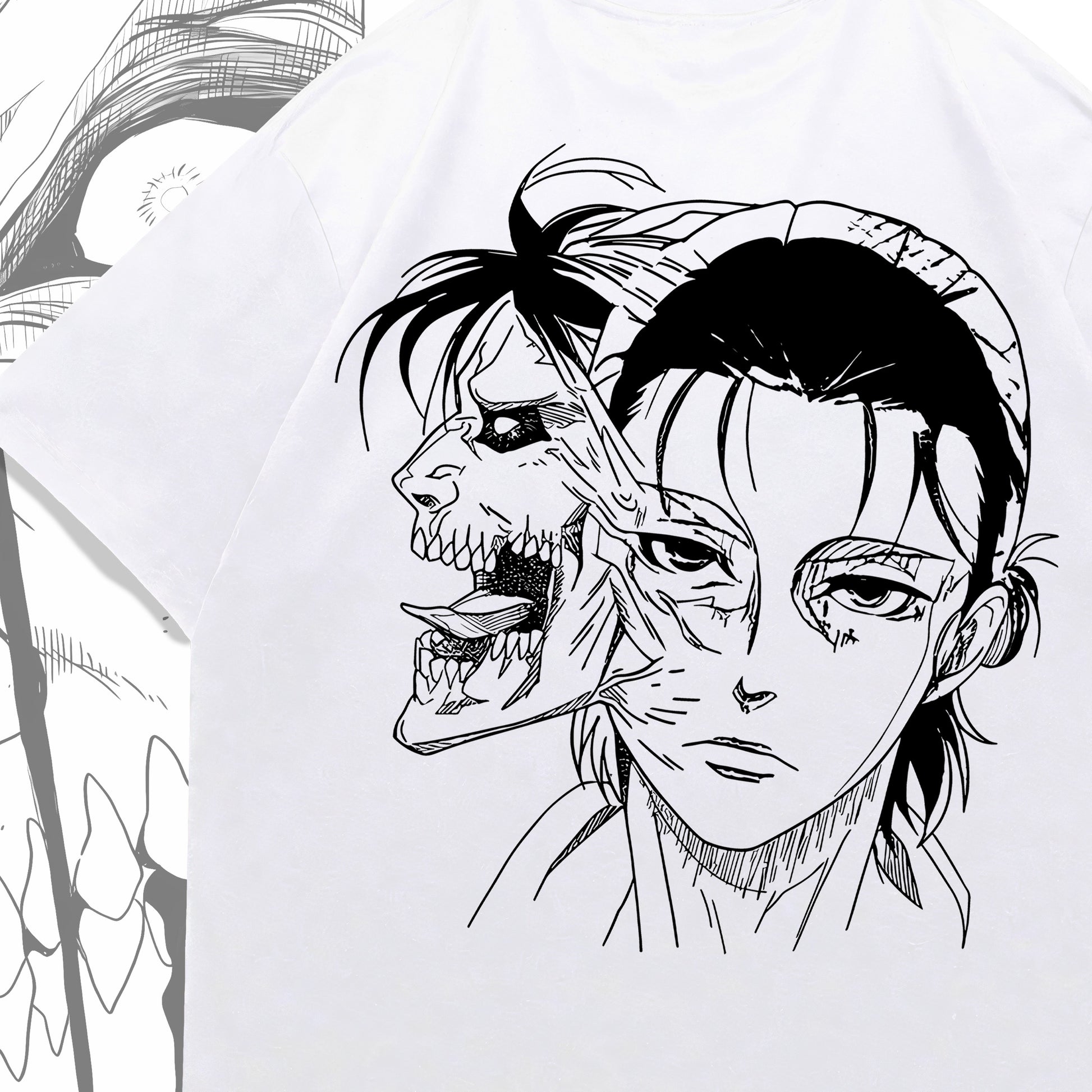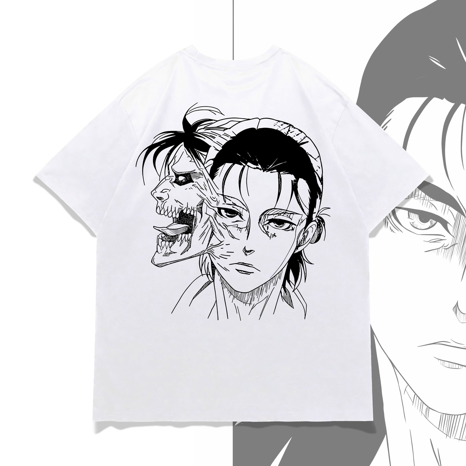 A bold, minimal manga-style tee showcasing Eren’s two identities — the boy seeking freedom and the feared Attack Titan.