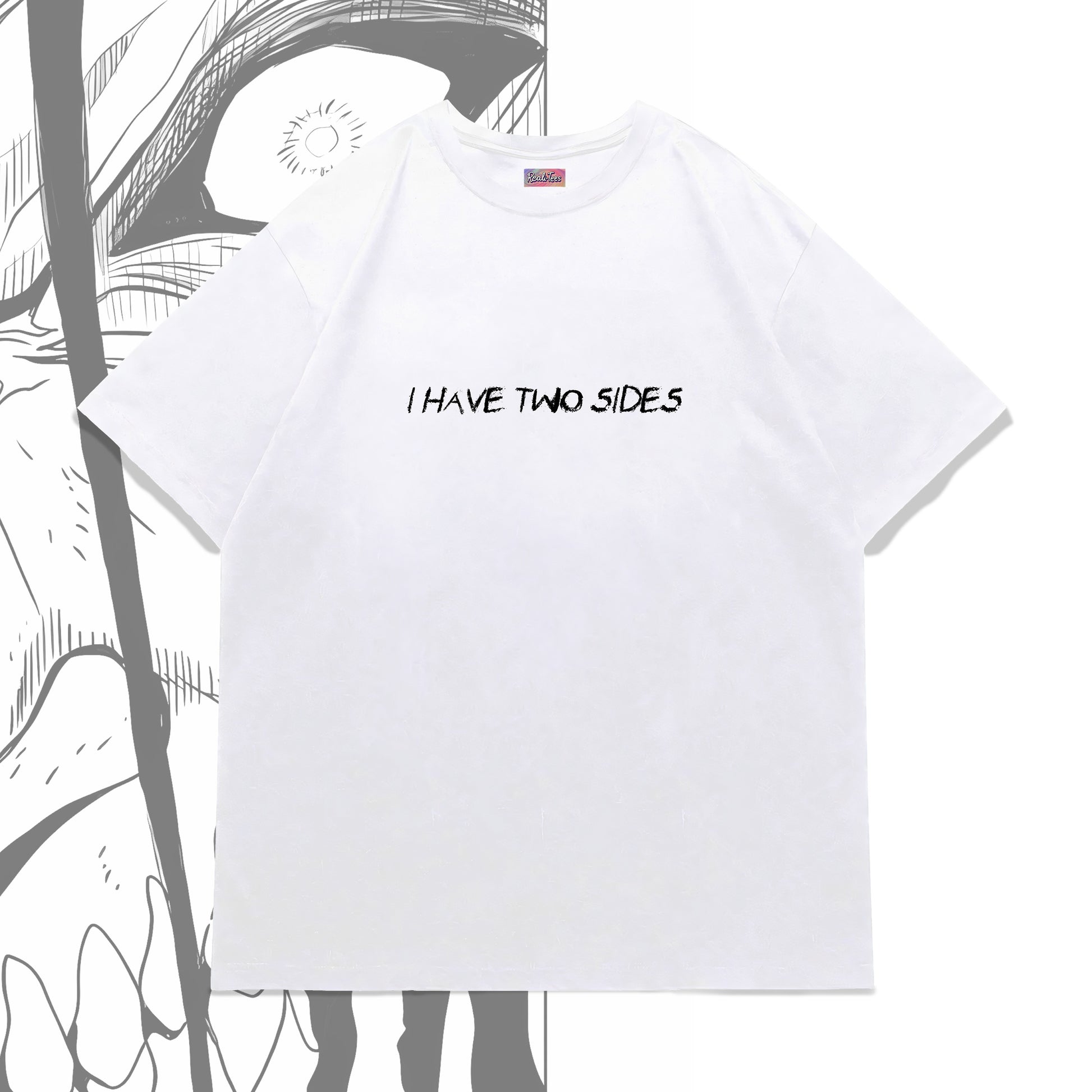 The front carries the line “I HAVE TWO SIDES”, while the back features a striking black-and-white illustration of Eren’s human and titan forms merged together.