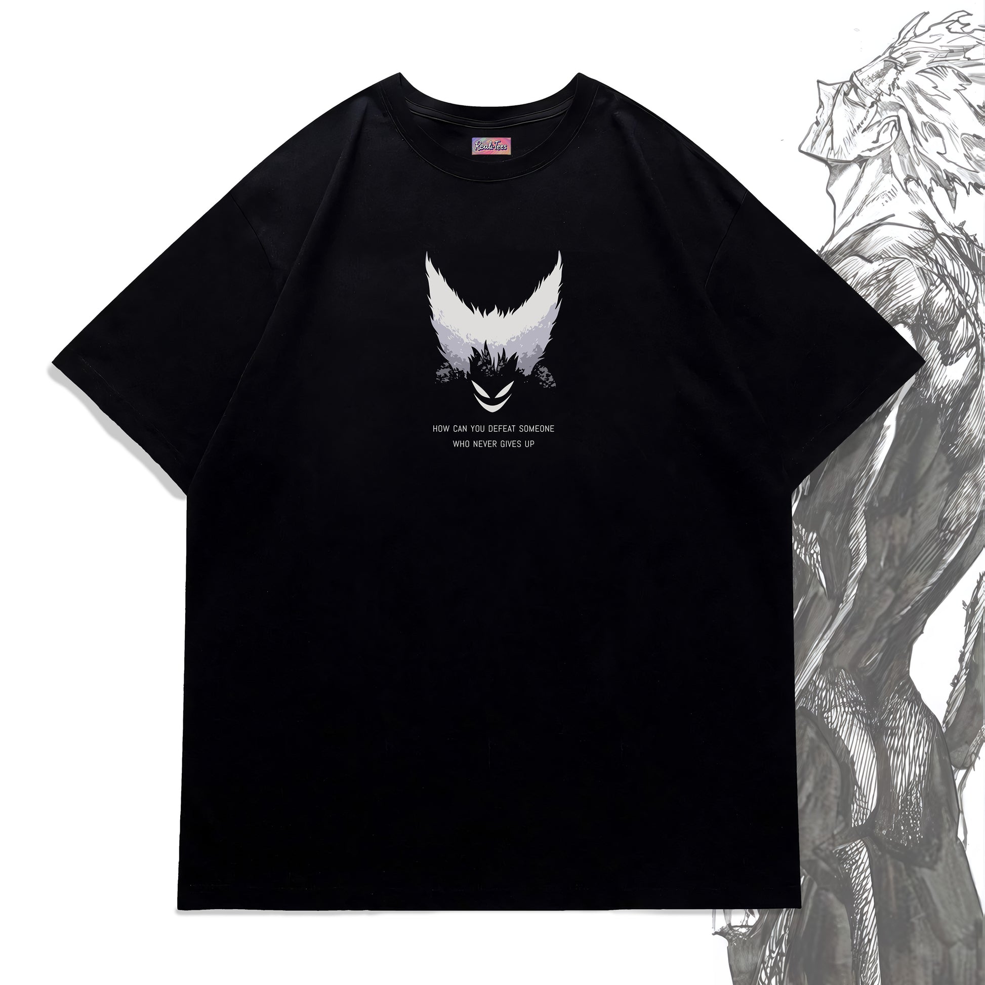 On the front: Garou's smirking silhouette with the words “How can you defeat someone who never gives up” — a mindset.