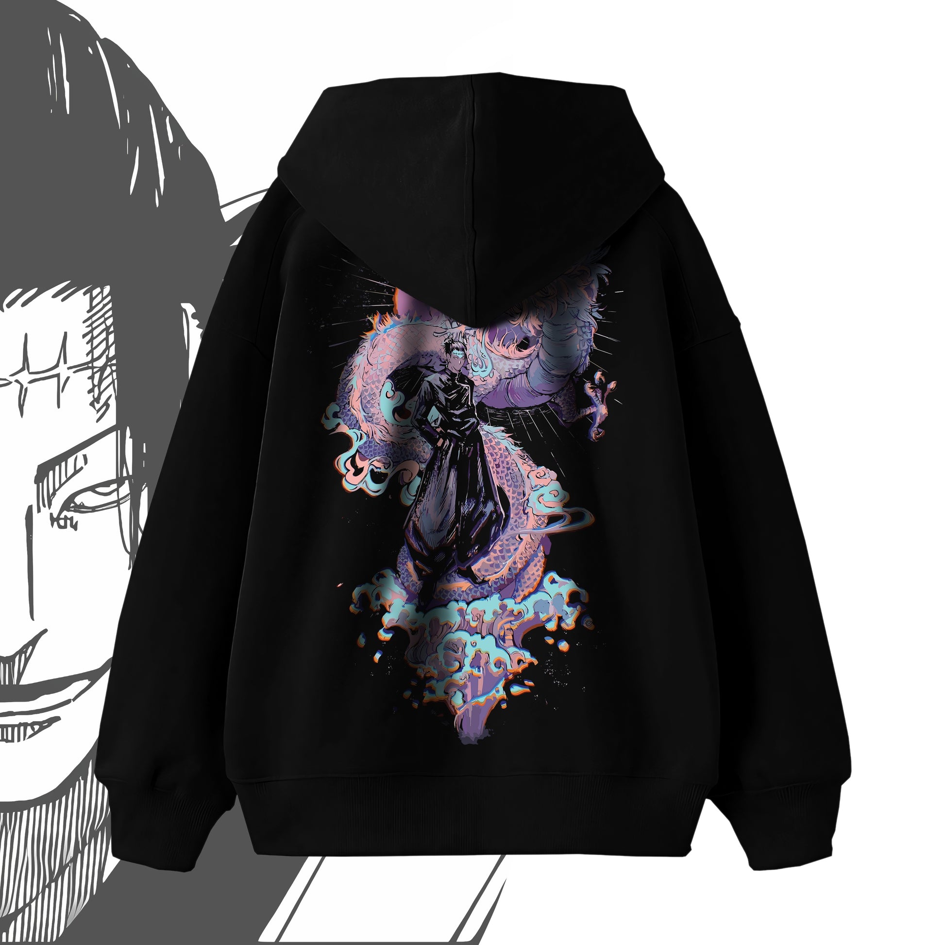 Channel the cold confidence of Suguru Geto with a hoodie that feels straight out of Jujutsu Kaisen’s darkest chapters. The front keeps things minimal with Geto’s iconic forehead stitches—subtle, intimidating, and instantly recognizable to real fans.