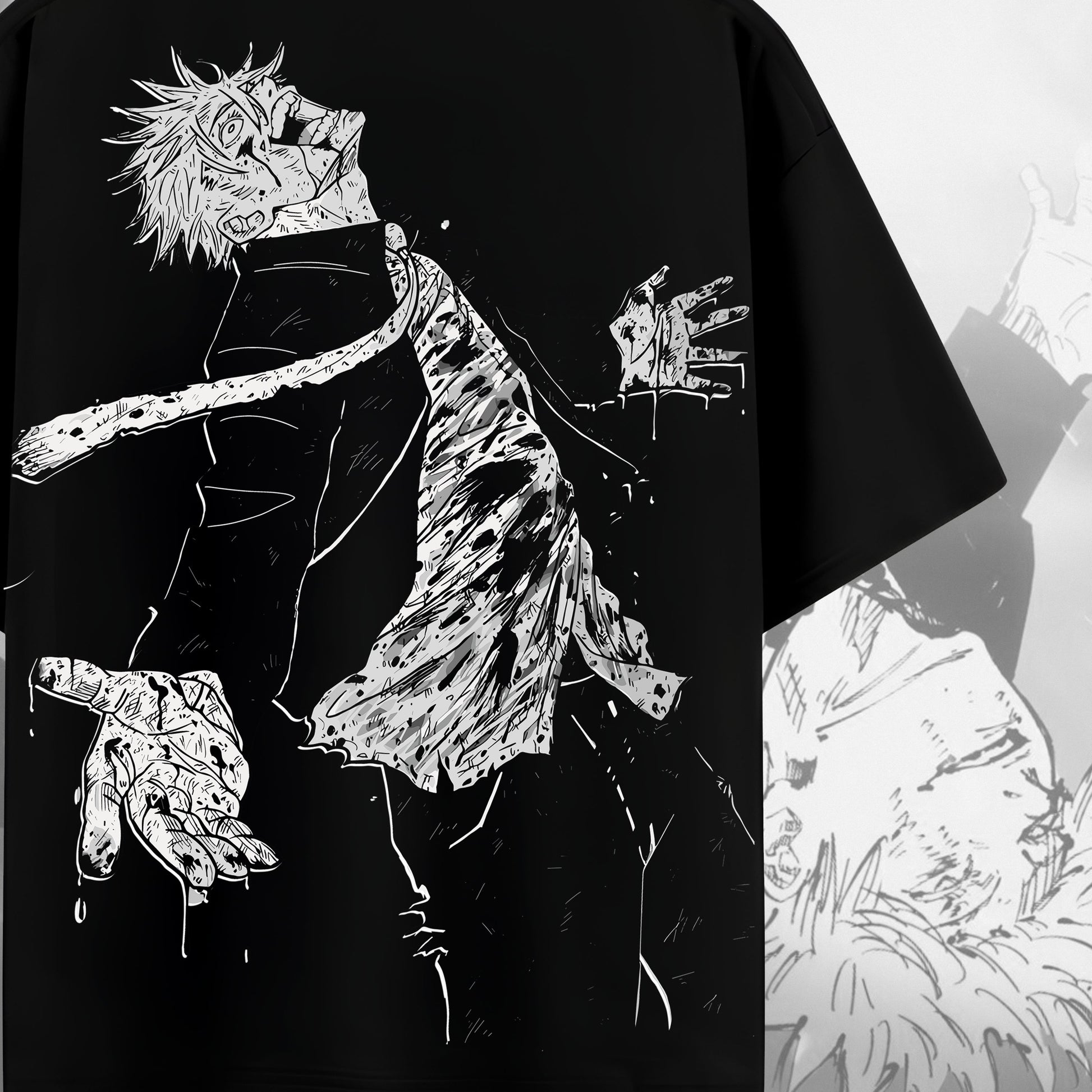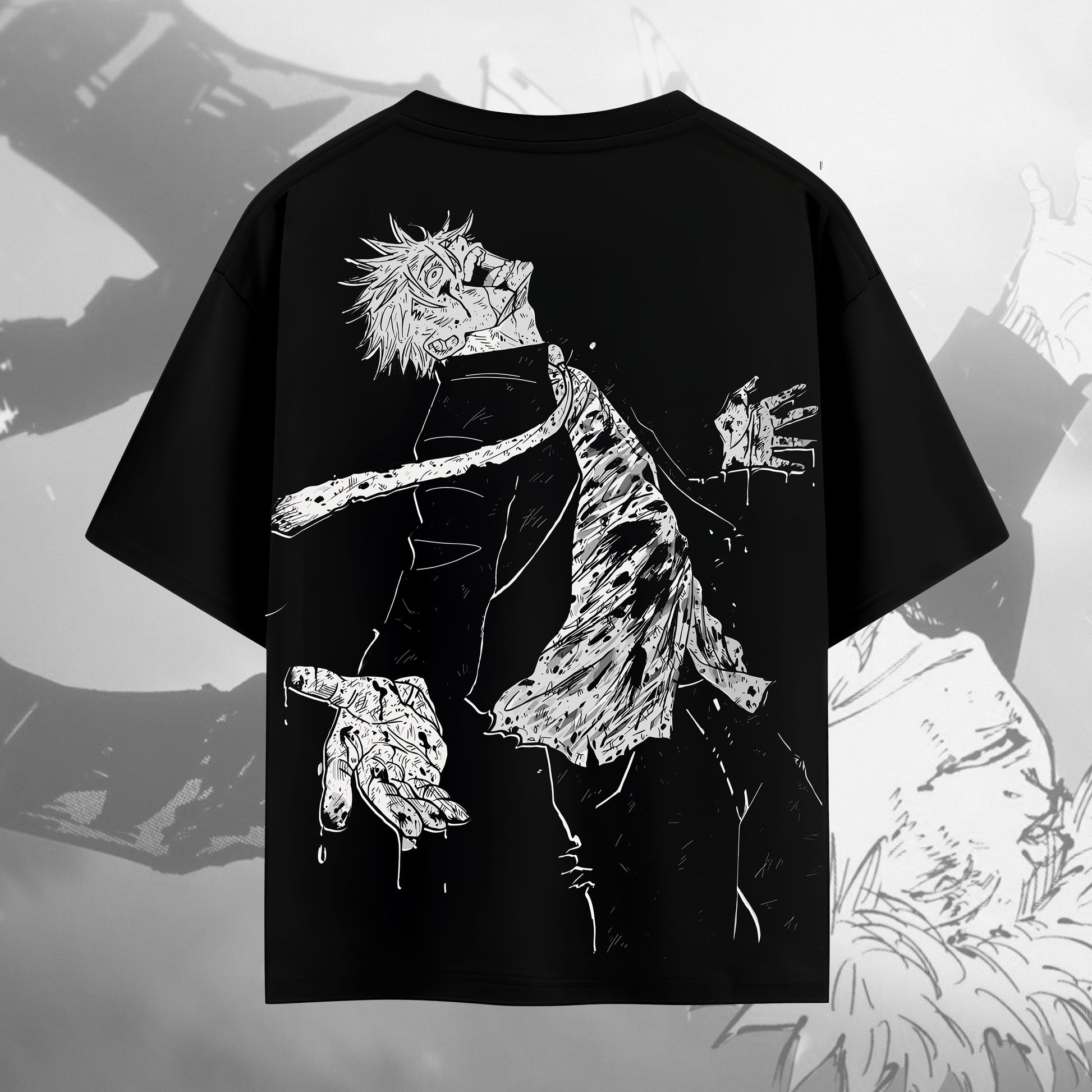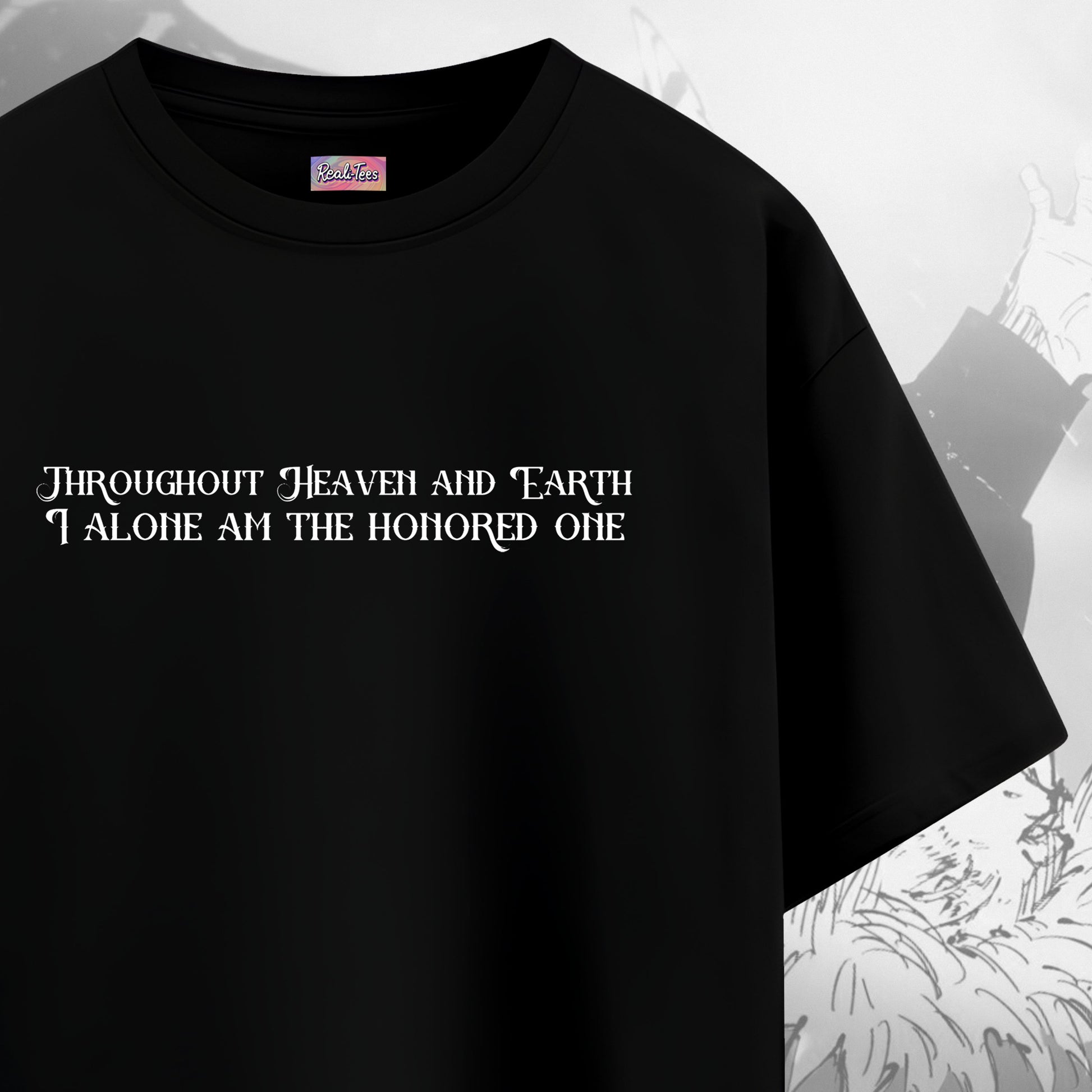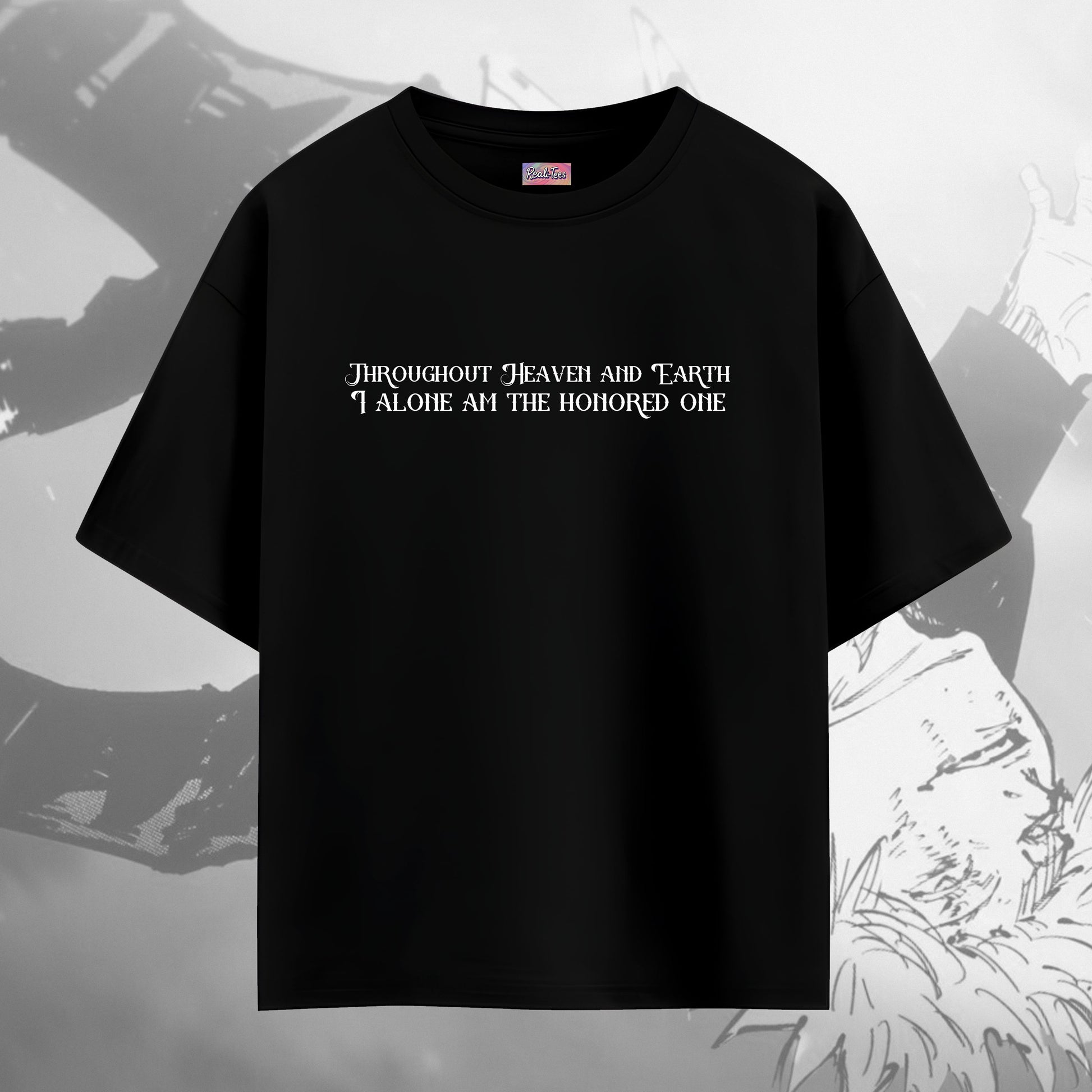 A tribute to the rise of the strongest. This black tee captures Gojo Satoru at his most divine — with his iconic declaration on the front and a raw, battle-scarred visual on the back. “I alone am the honored one” isn’t just a quote — it’s a statement of supremacy.