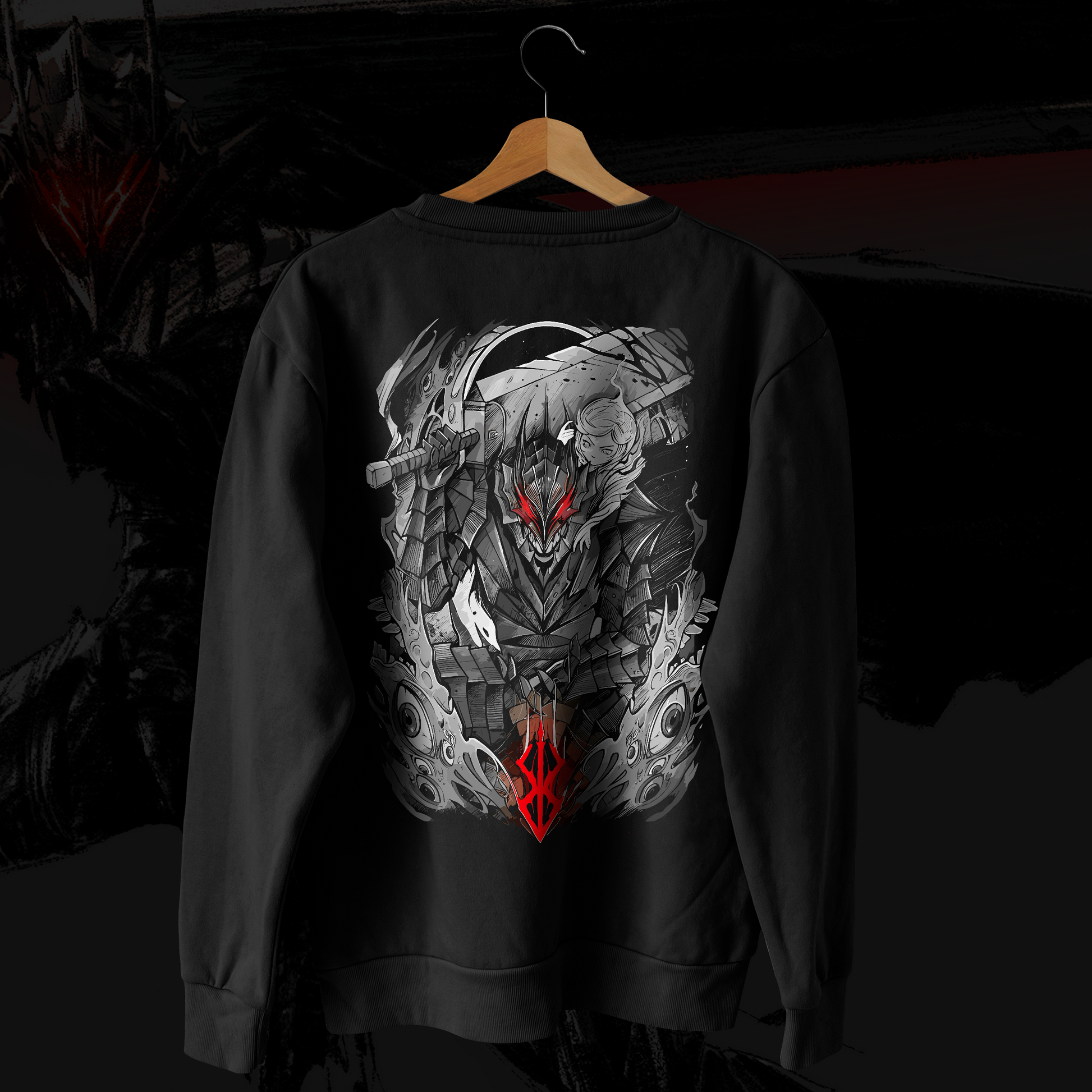 Brand your devotion to the struggler with this bold Berserk Sweatshirt. Featuring Guts' Imposing Black Armor, this sweatshirt lets the world know you stand with the Black Swordsman. Whether you're battling apostles or conquering your day, this Berserk sweatshirt is the perfect companion.