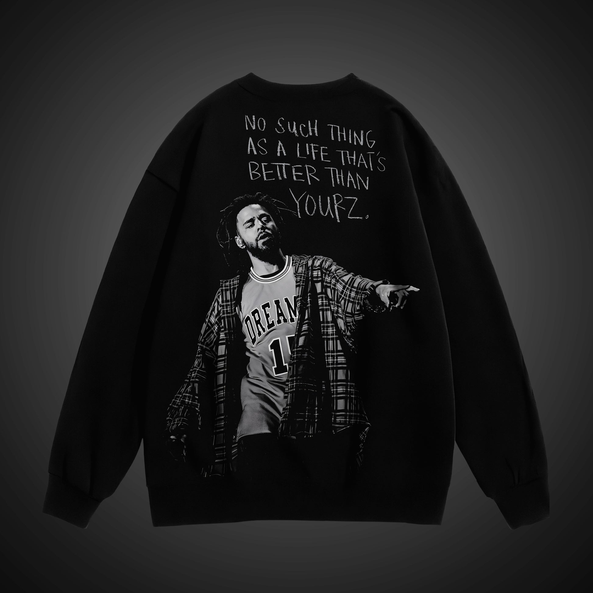 A tribute to one of J. Cole’s most powerful messages, this sweatshirt blends minimal style with deep meaning. The front carries the clean “Love Yourz” script, while the back features a striking monochrome portrait of Cole with the lyric, “No such thing as a life that’s better than yourz.” The premium construction delivers a bold streetwear aesthetic, making it a must-have for fans of J. Cole and Dreamville.