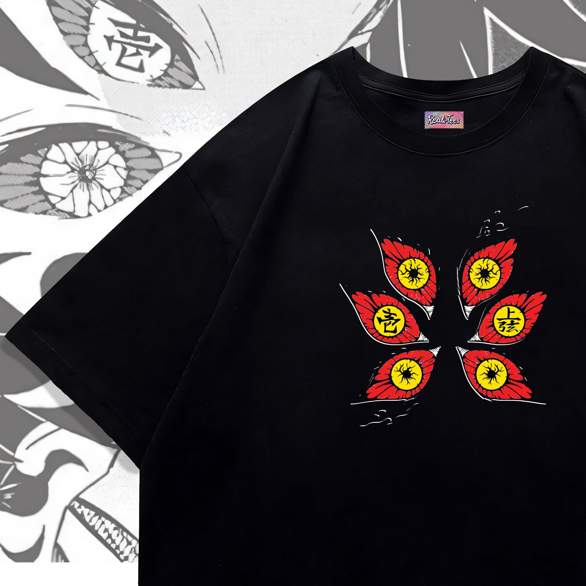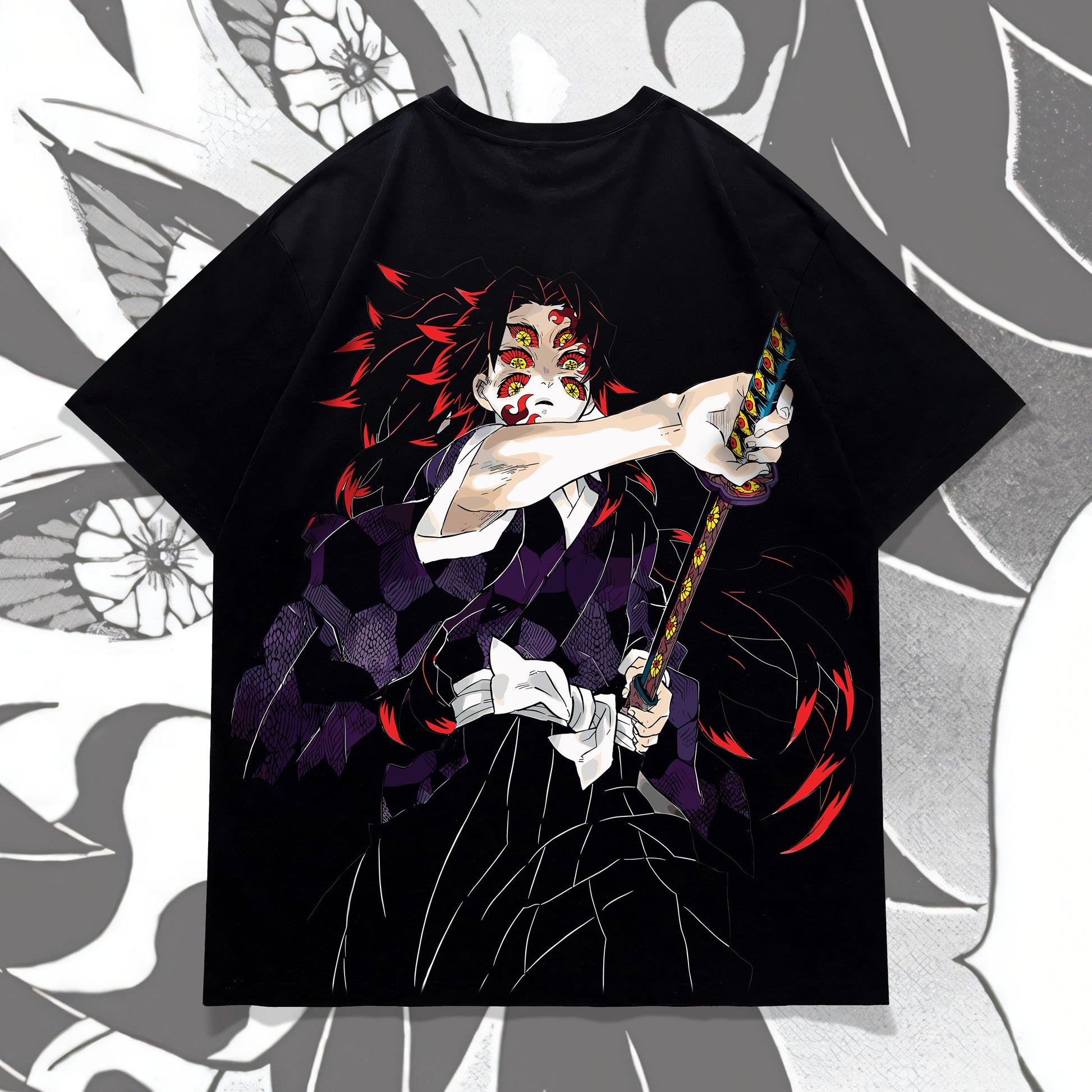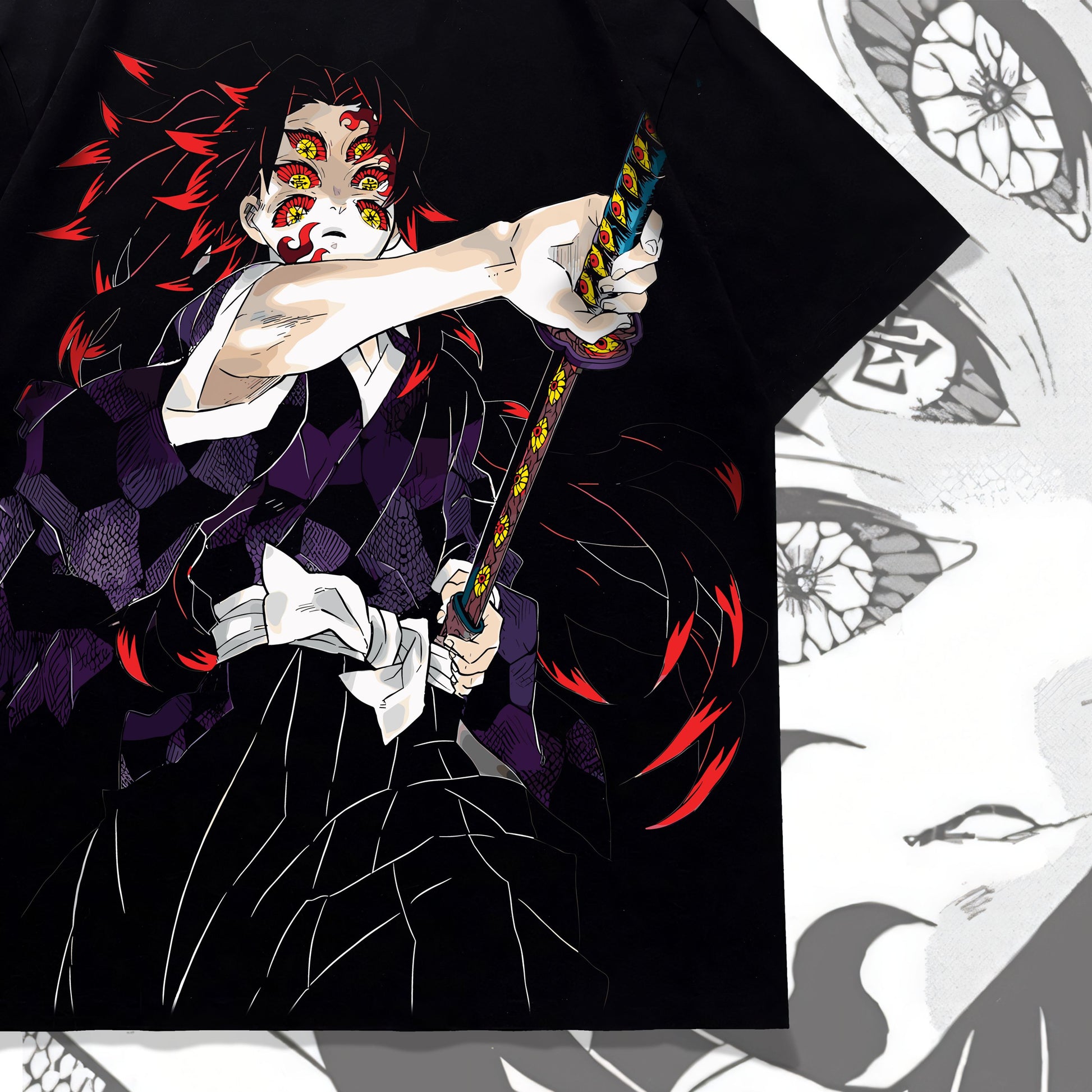 Channel the terrifying presence of Kokushibo, Upper Moon One, with this striking oversized tee. The back captures his menacing stance, six eyes blazing with fury as he wields his crescent moon blade. The front carries a sharp eye-cluster motif, symbolizing his inhuman power and unshakable dominance. A bold design that fuses anime artistry with streetwear edge.
