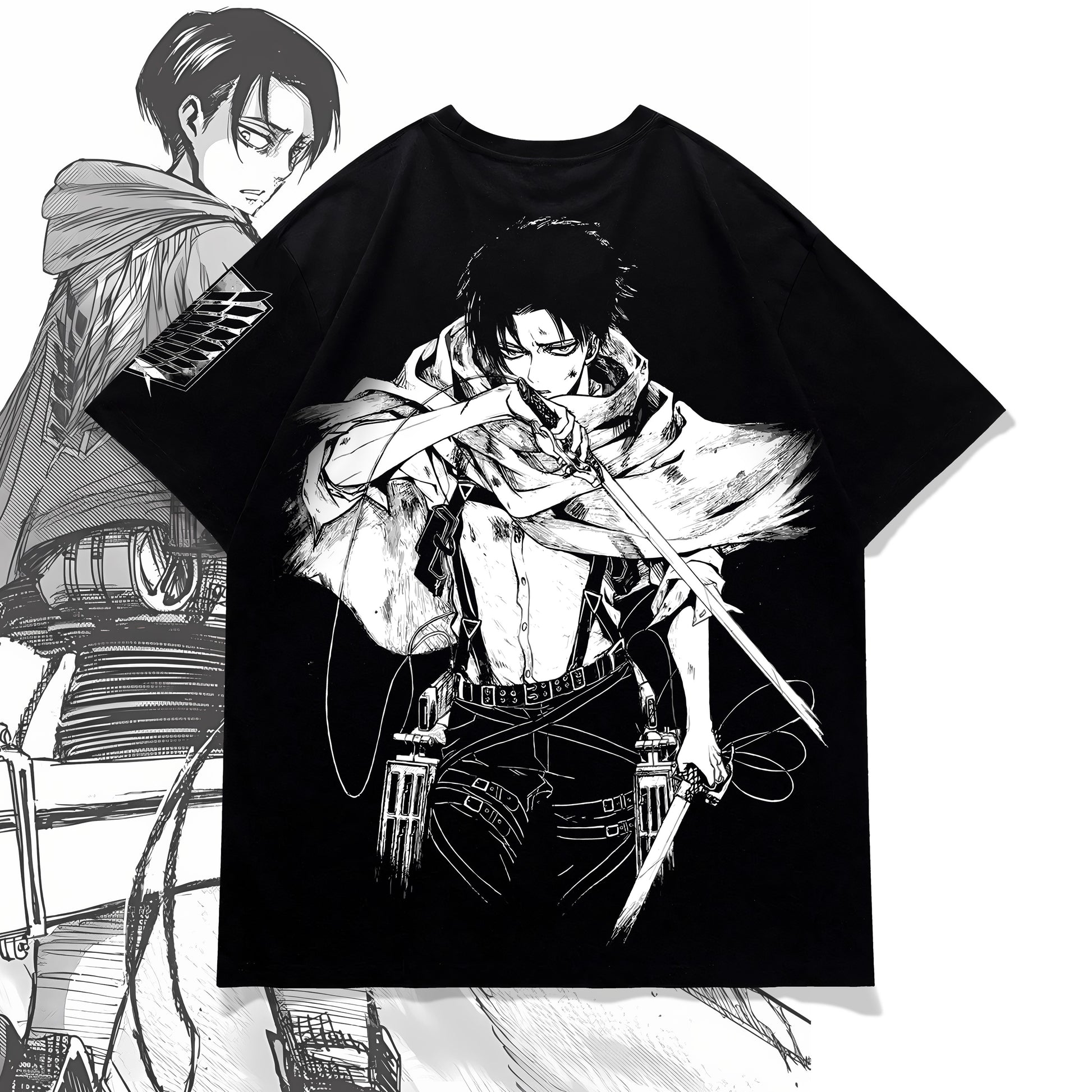Rendered in high-contrast manga linework on deep black fabric, this tee is built for fans who respect precision over noise. A tribute to the soldier who never flinched, even when humanity did.