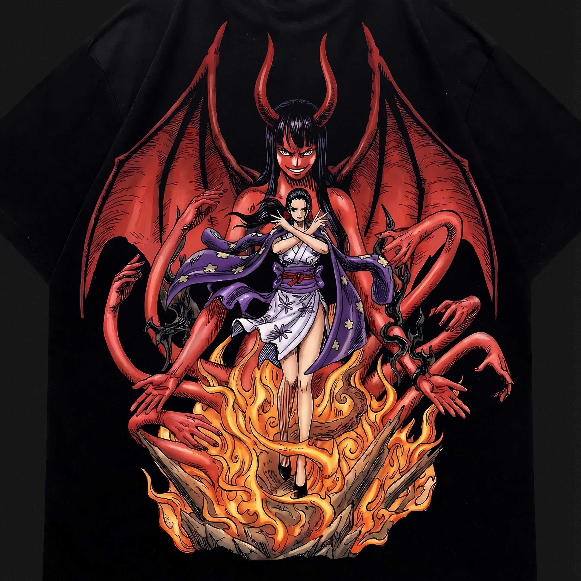 Embrace the dark elegance of the Archeologist with this Nico Robin "Devil Child" oversized tee. Featuring her formidable "Demonio Fleur" form in a high-contrast, fiery back print, this design captures the raw power and haunting beauty of the Straw Hat crew's most mysterious member. Perfect for fans who want a bold, maximalist aesthetic that stands out in any crowd.