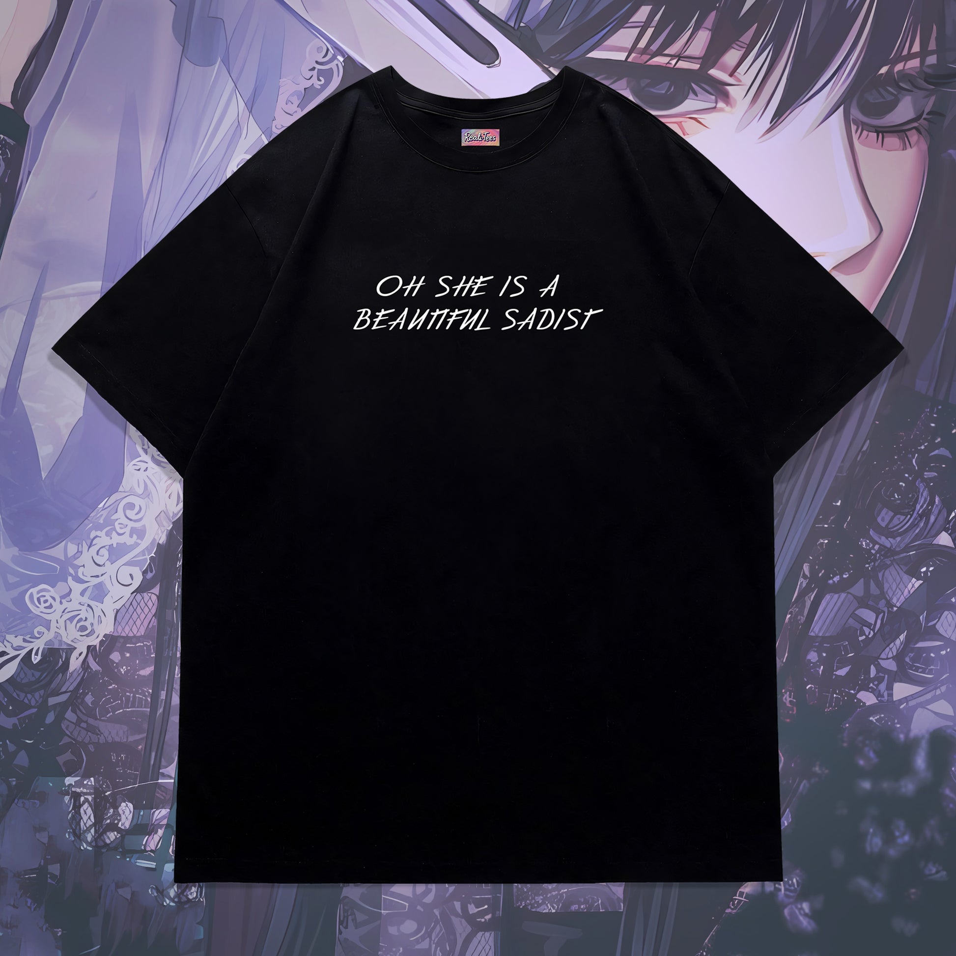 A shirt as ruthless as its muse — Osaragi from Sakamoto Days. The front whispers menace with the line “Oh she is a beautiful sadist,” while the back unleashes a striking full art of Osaragi wielding her deadly blade. Dark, stylish, and unflinching, this tee is built for fans who want their anime fits to hit as hard as their favorite assassin.