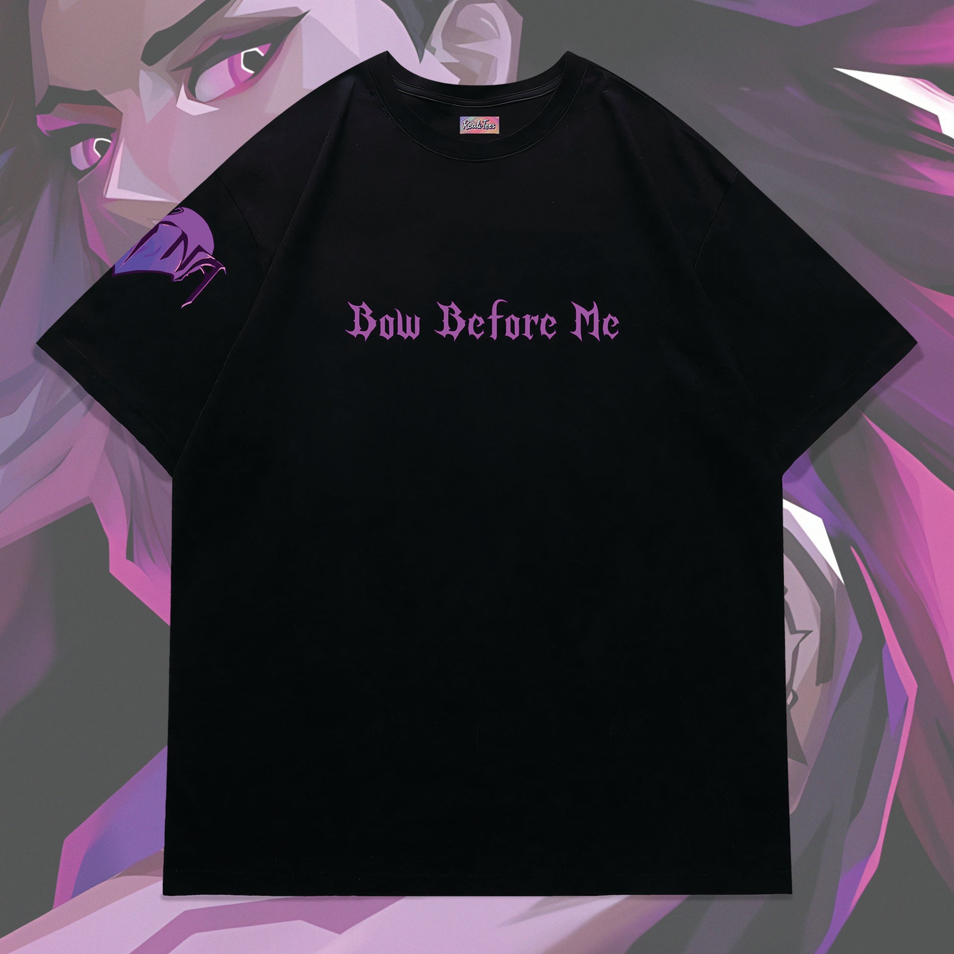 The Empress commands respect. The front sets the tone with her chilling line “Bow Before Me” in gothic lettering, while the back unveils a powerful full artwork of Reyna in her Empress state, surrounded by violet energy and dark floral accents. A tee made for players who embrace her ruthless dominance and play every match like a queen.