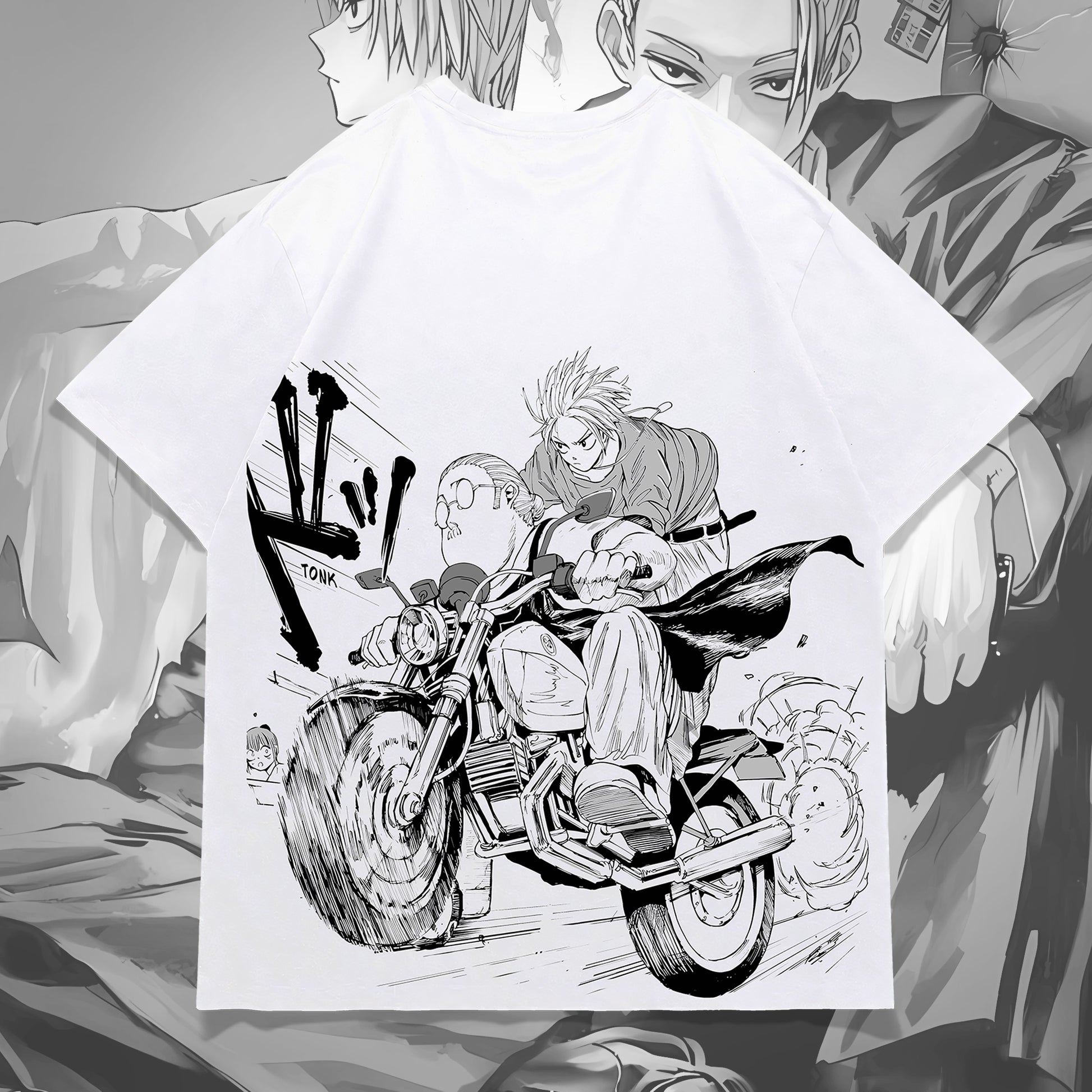 A must-have for Sakamoto Days fans, this tee captures the dynamic duo in one of their most iconic moments — Sakamoto and Shin tearing through on a roaring motorcycle. The front keeps it simple with a sharp “Sakamoto Days” text, while the back brings the manga to life in bold black-and-white art. Equal parts stylish and nostalgic, it’s the kind of shirt that makes a statement both for anime fans and streetwear lovers.