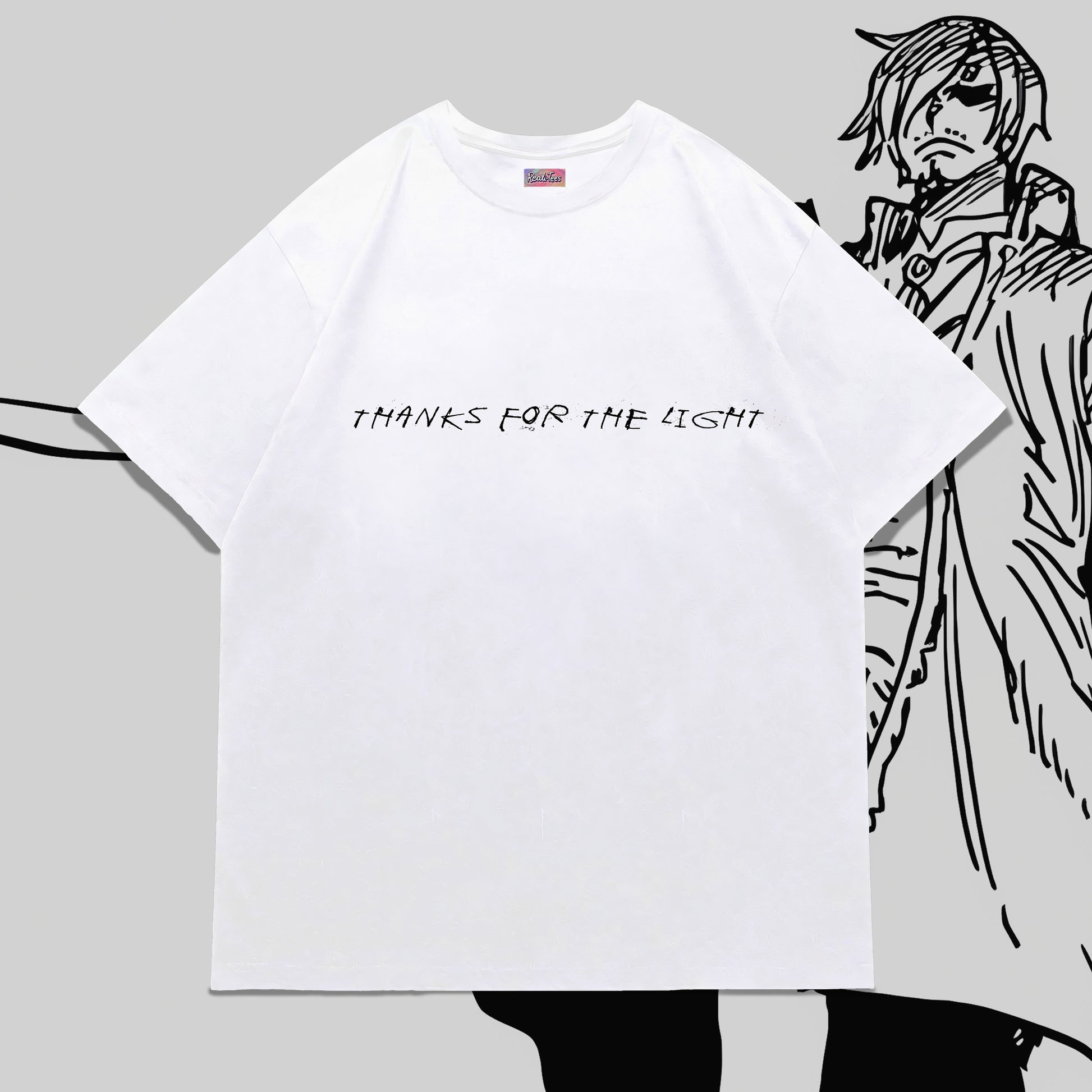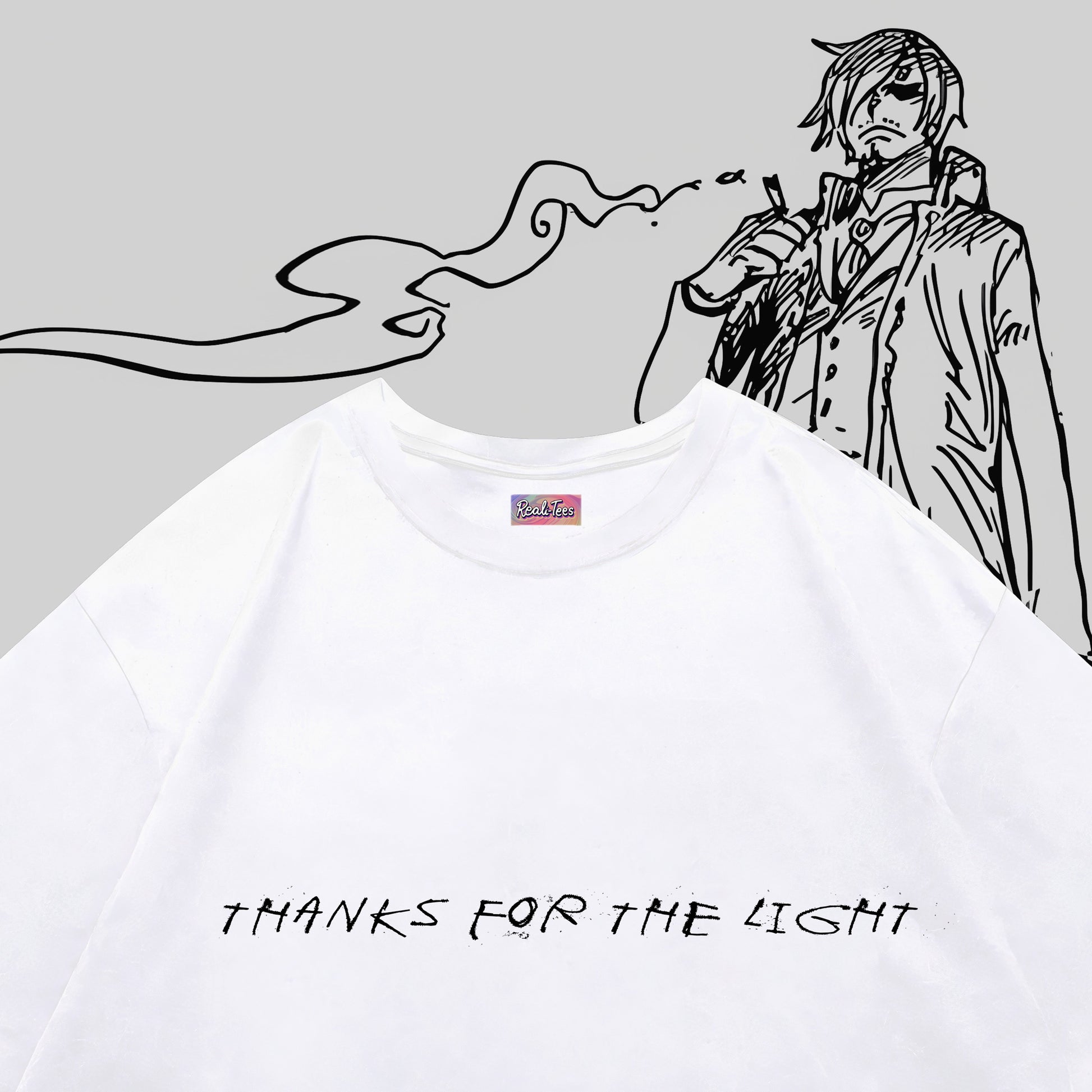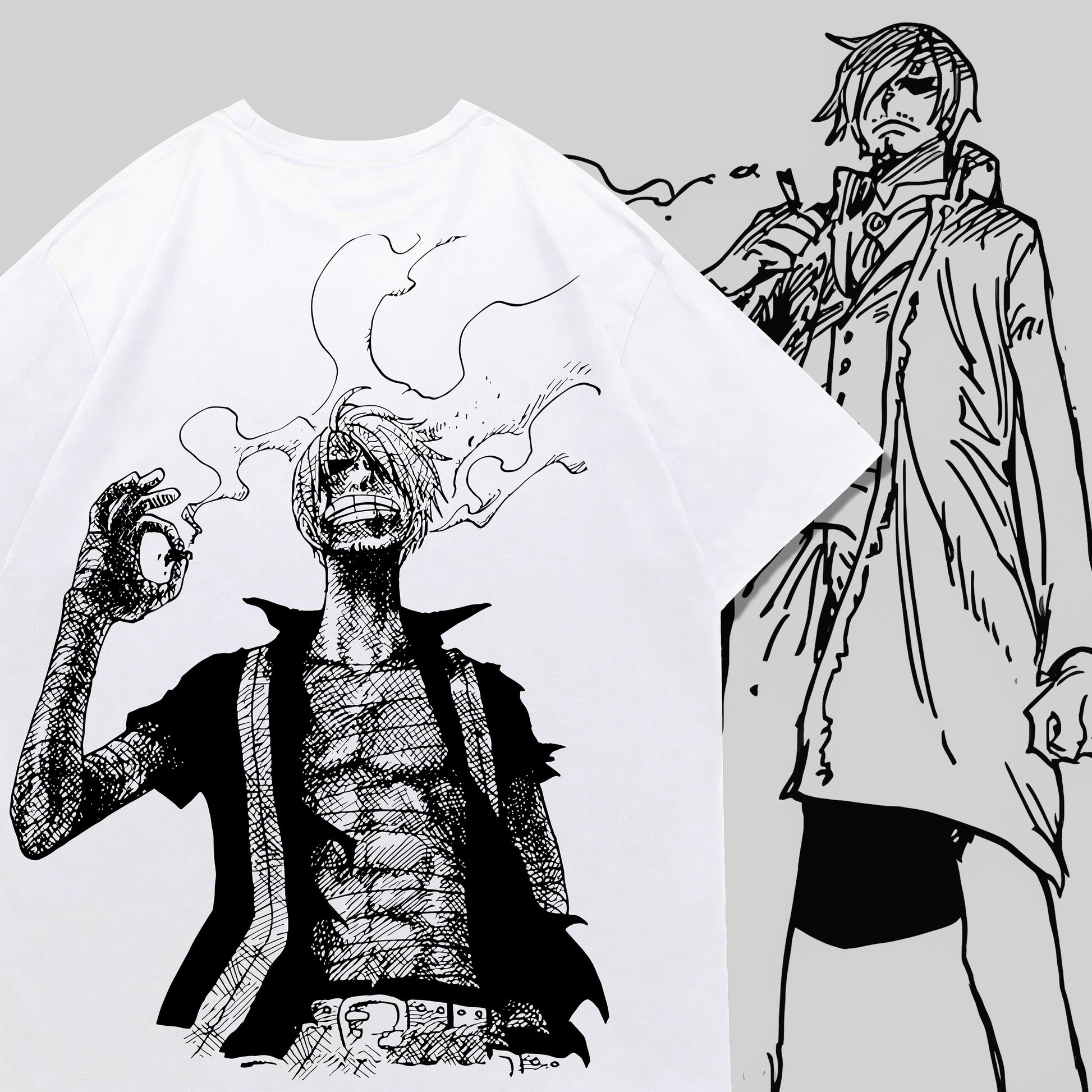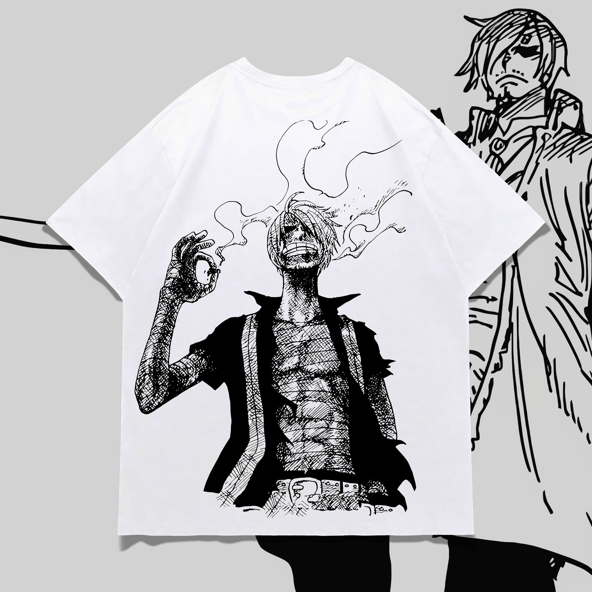 A homage to one of Sanji’s most iconic manga moments. The front keeps it subtle with the line “Thanks for the light”, while the back showcases a raw, ink-heavy illustration of Sanji calmly lighting his cigarette amid the chaos — the exact scene that cemented his cool-factor in the series.