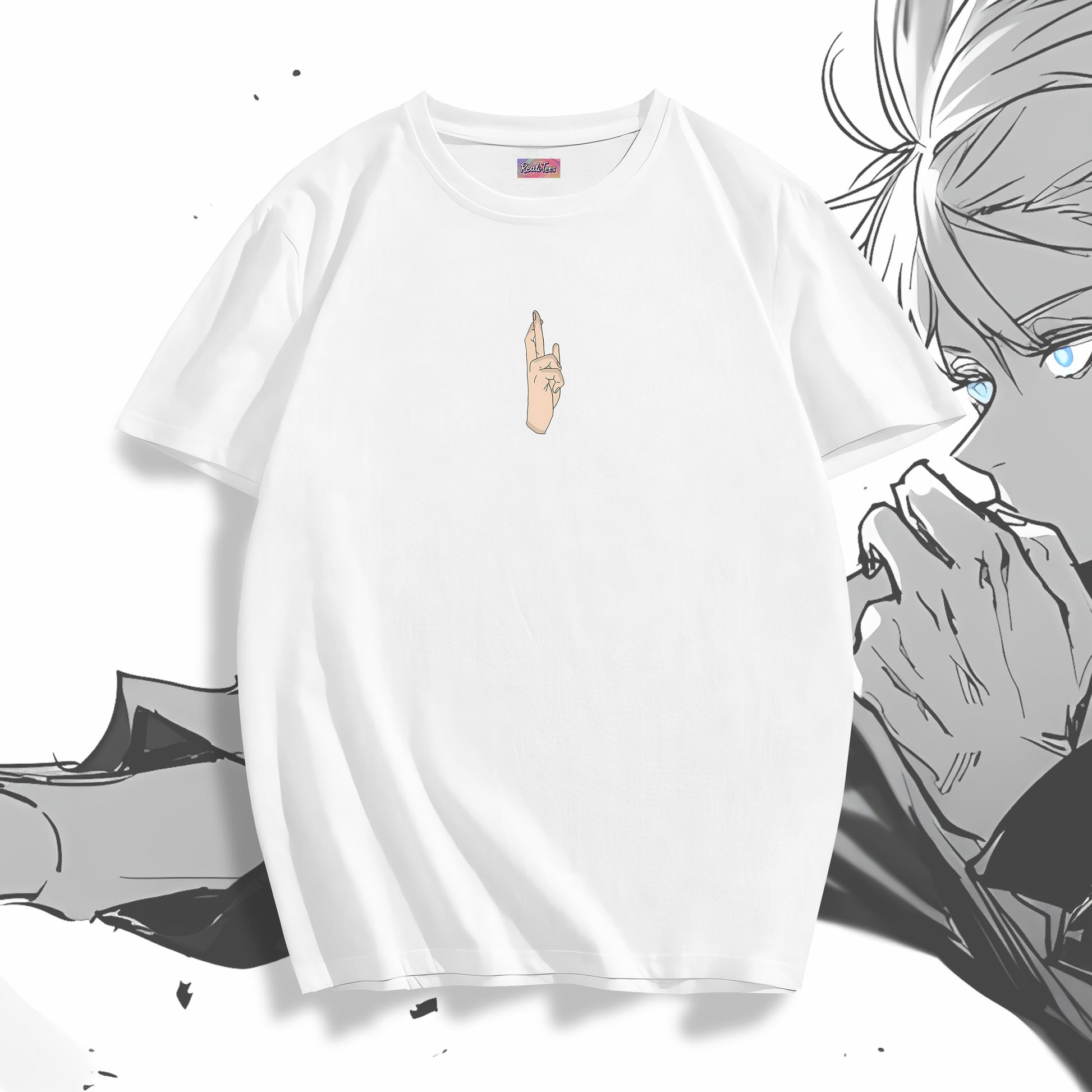 A clean yet striking tribute to the strongest sorcerer. The front keeps it minimal with Gojo’s iconic hand pose, while the back erupts into a full manga-style frame of his Unlimited Void—sharp lines, bold expressions, and pure domain expansion energy. A must-have for every JJK fan who loves peak Gojo moments.