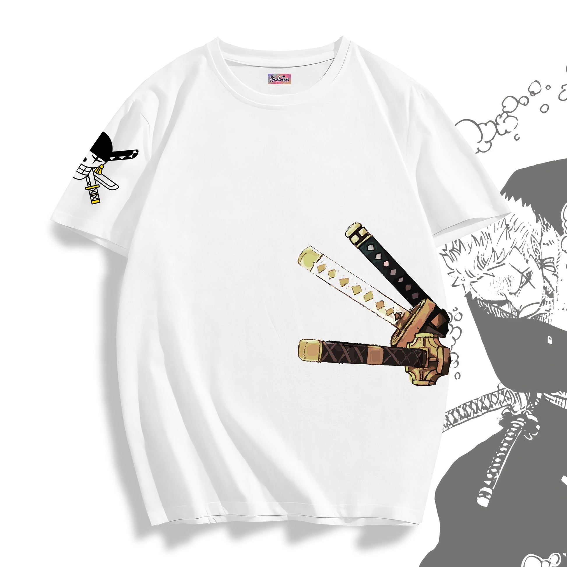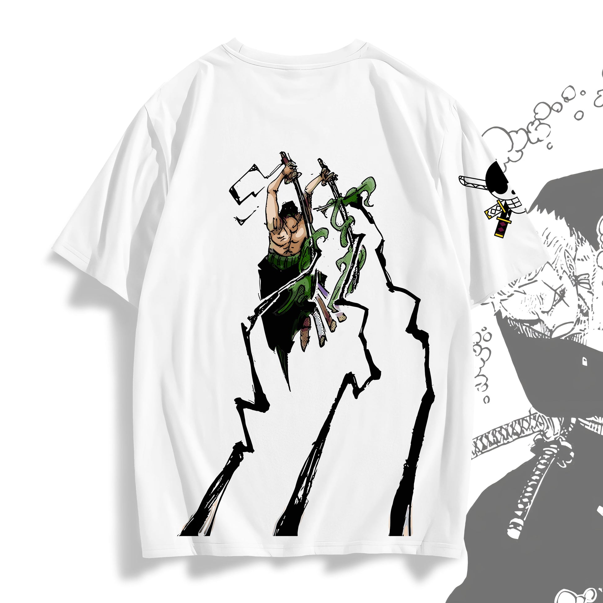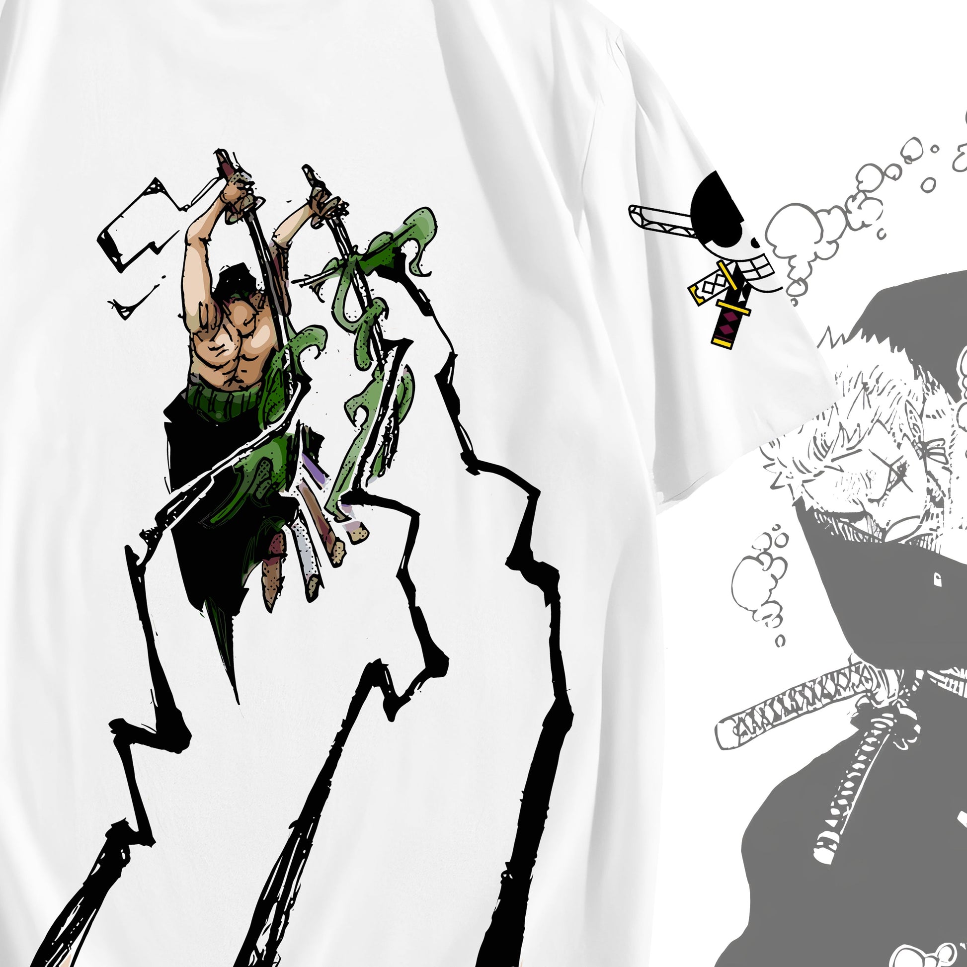 Wield power like the Pirate Hunter himself. This bold white tee features Zoro’s iconic three swords sheathed on the front and an electrifying illustration of him mid-strike on the back, tearing through the mountain in pure Wano-style badassery. With mini sword details on both sleeves, this design is every Zoro fan’s dream — fierce, focused, and forged in steel.