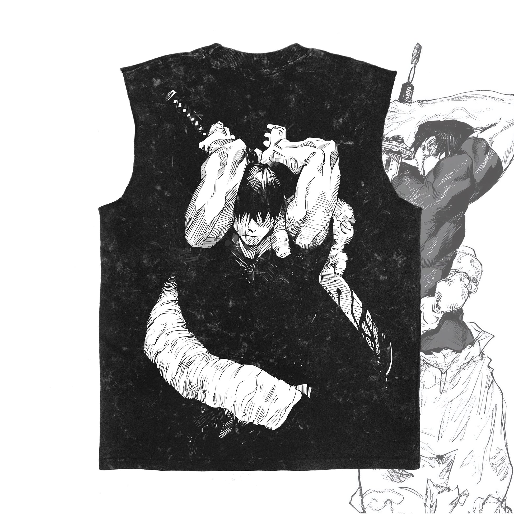 This acid-washed tank channels Toji Fushiguro’s lethal presence — captured mid-draw with raw intensity and zero hesitation. The back shows the assassin ready to strike, while the front features a crisp katana detail — subtle yet deadly.