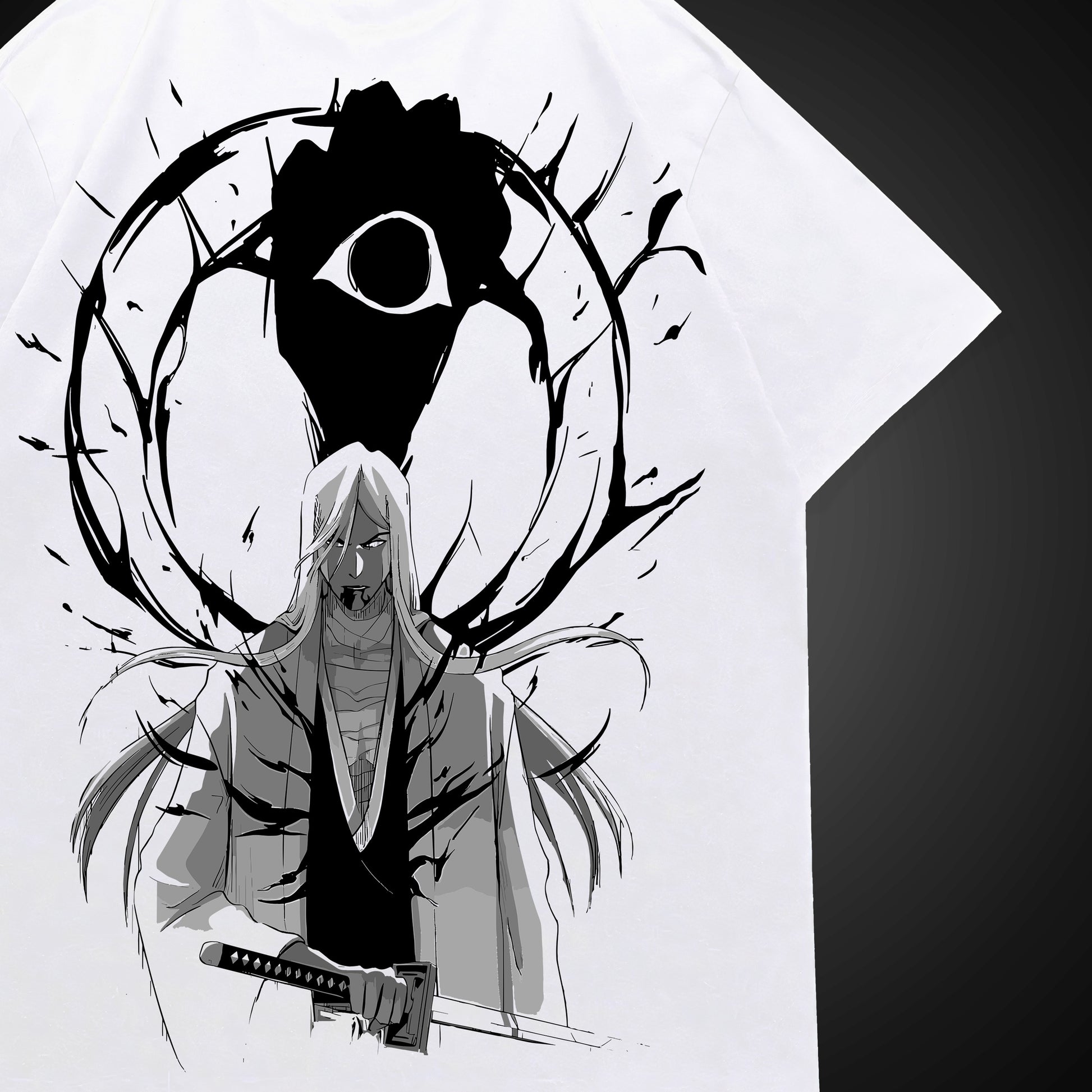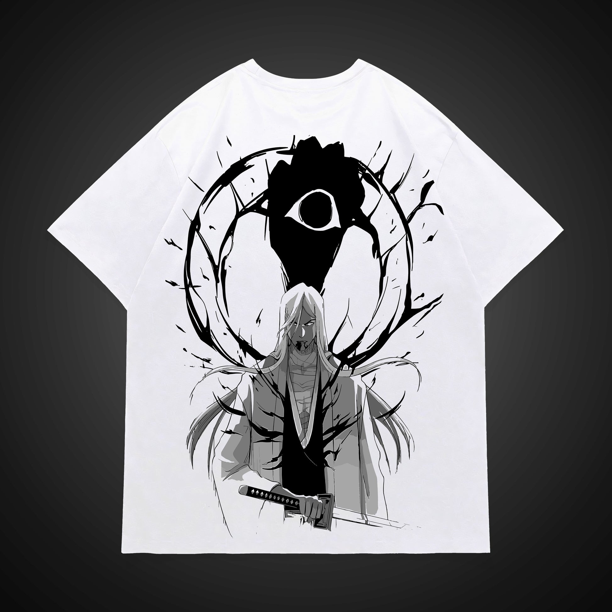 Channel the serenity and hidden darkness of the 13th Division Captain. This design features the minimal Squad 13 insignia on the front and a stunning ink-wash masterpiece on the back, depicting Jūshirō Ukitake tethered to the shadow of Mimihagi. A perfect blend of elegance and ominous power for the ultimate Bleach fan.