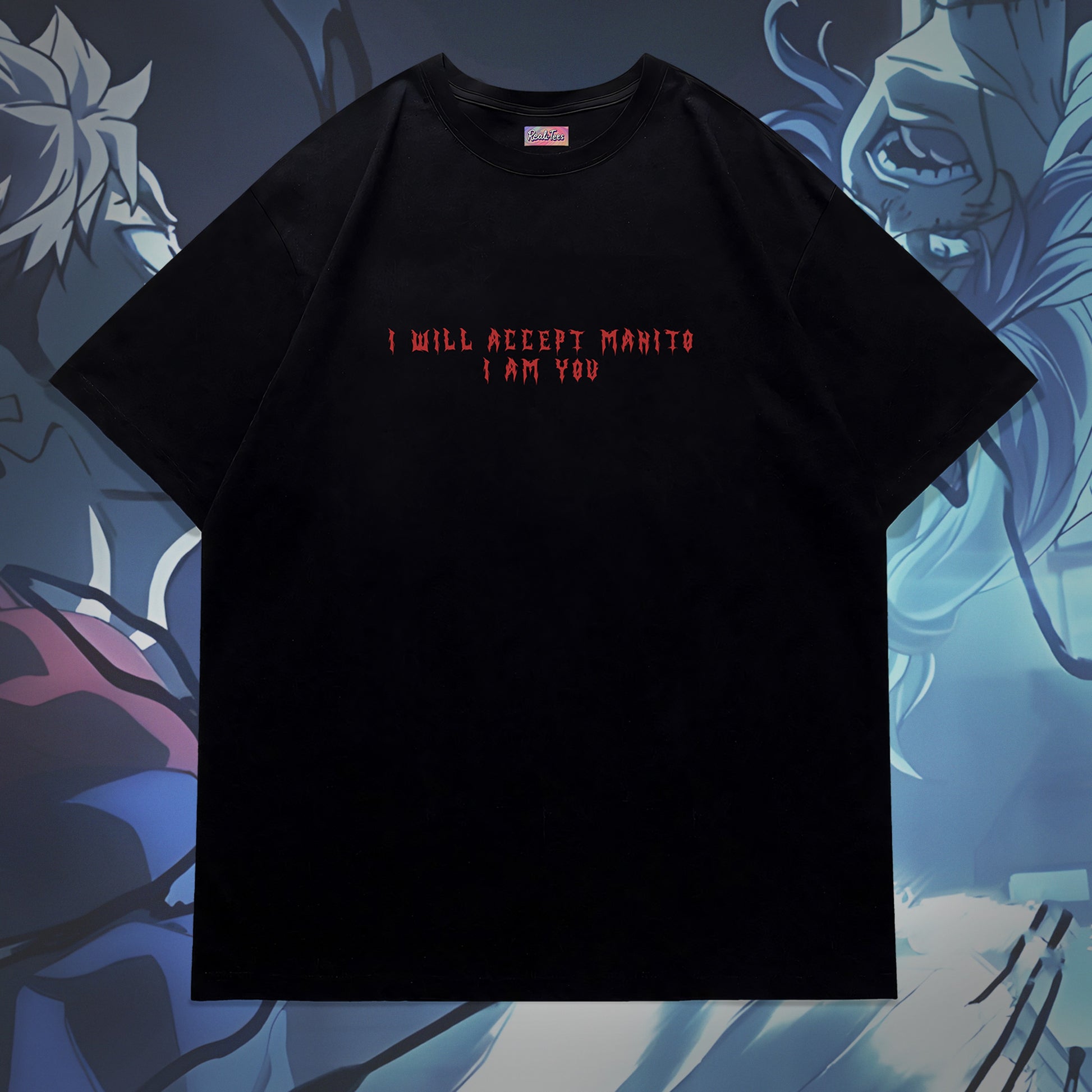A black tee featuring Yuji’s haunting acceptance of Mahito, with a chilling quote on the front and a vivid graphic clash on the back. For fans who embrace the darker side of Jujutsu Kaisen.