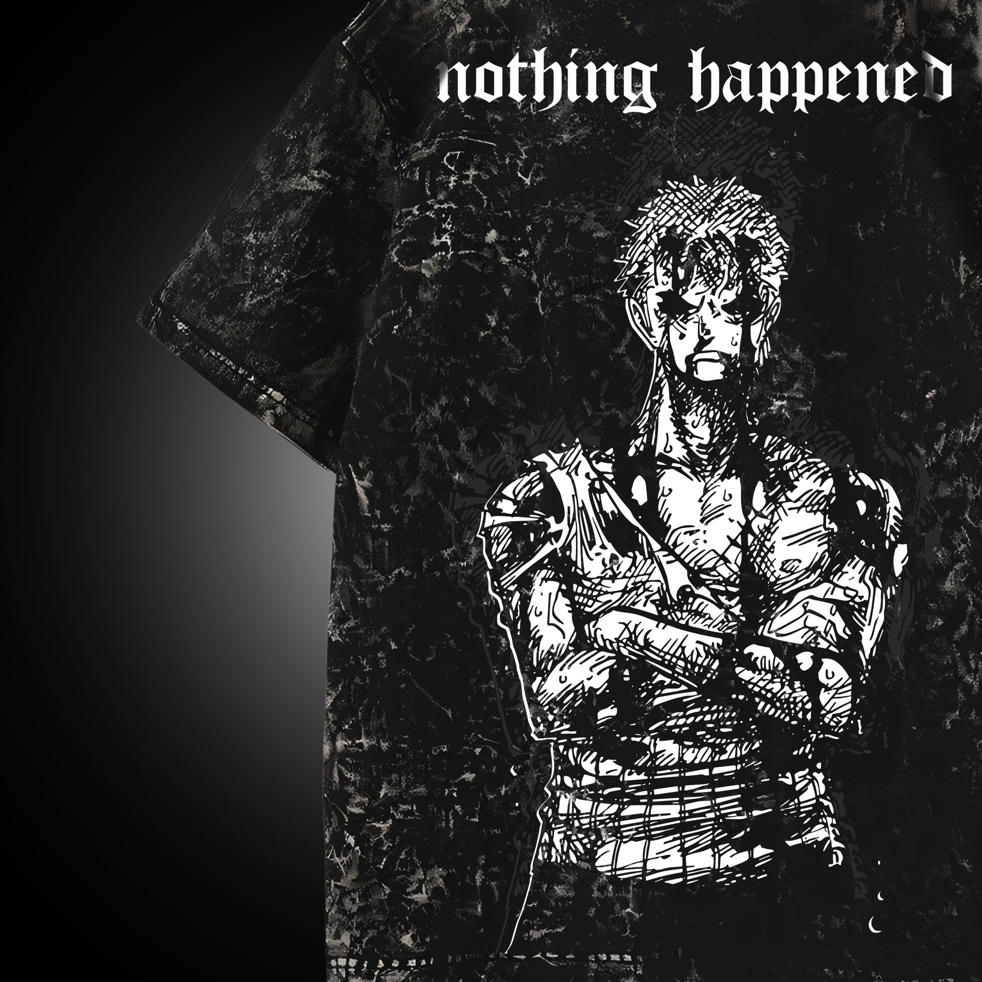 This tee captures that exact energy. Stark line art on the back, carved in white against a stormy acid-wash black. The words “nothing happened” sit above like a quiet oath. If you know, you know.